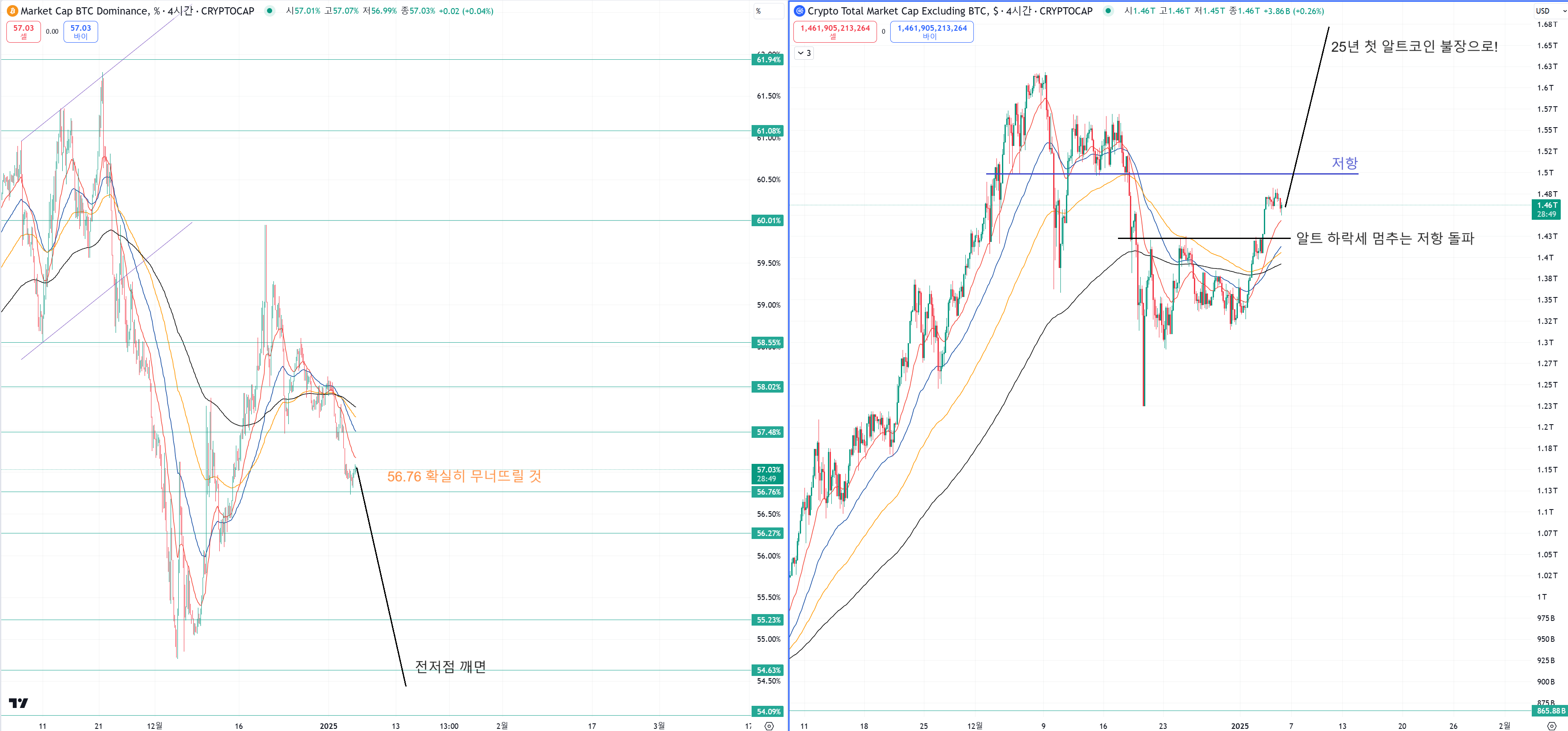 도미넌스쪽이 먼저 무너뜨리면 알트코인 시총 저항도 결국은 넘어갈 확률이 높습니다.