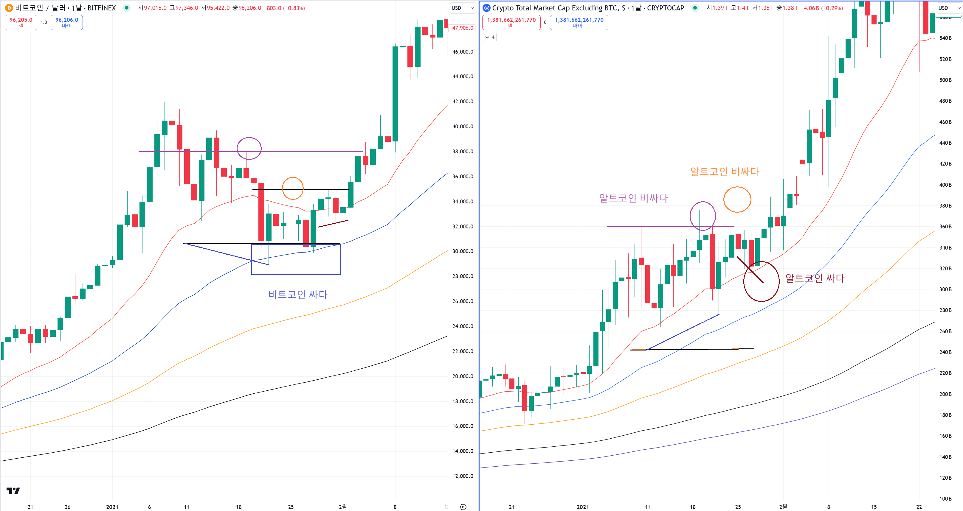 어쨌든 21년 상황을 보면 비트코인이 먼저 싸진다음에 알트코인 불장타이밍이 나오는 모습 확인하시고