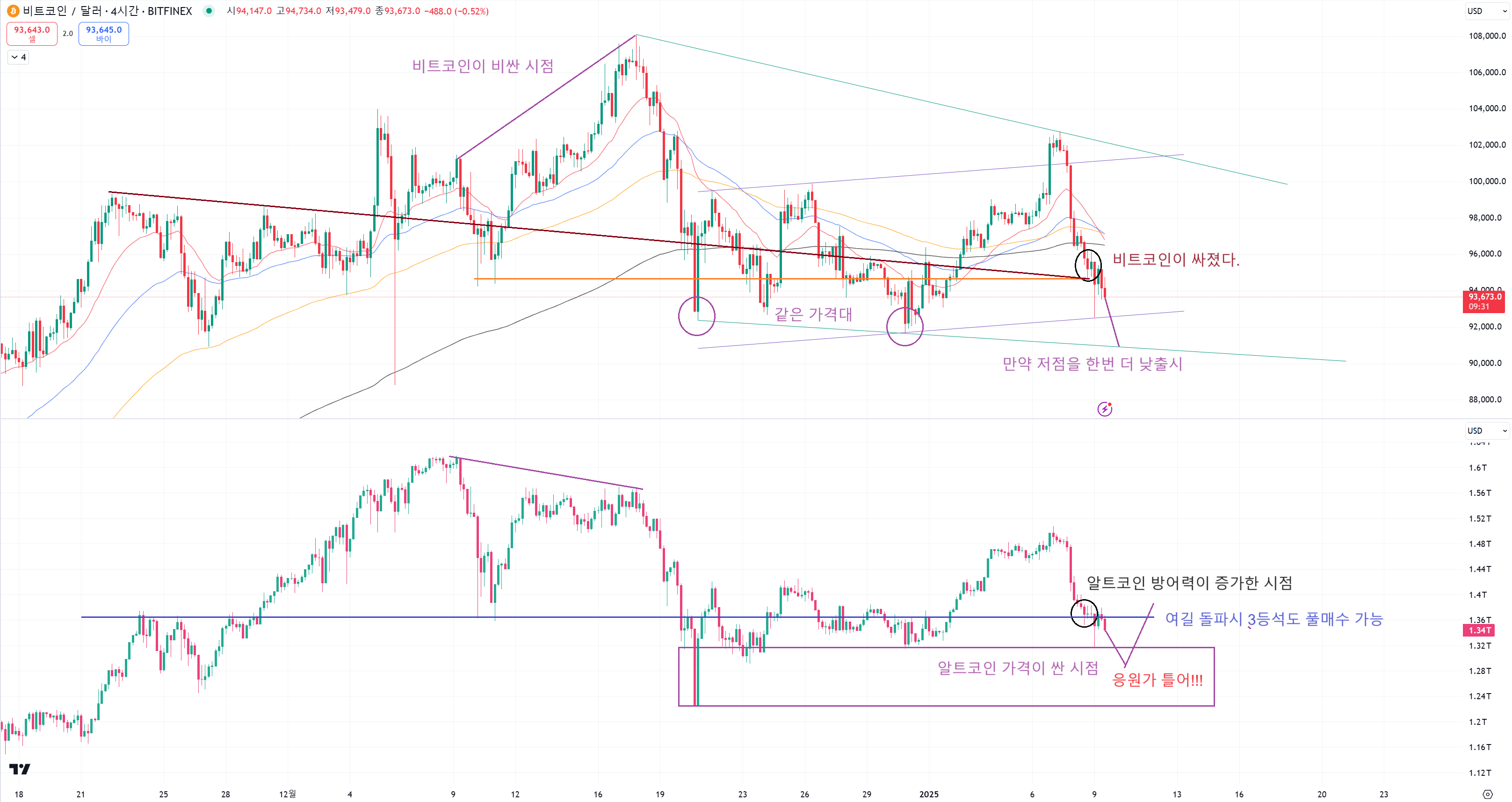 위에는 비트코인 차트. 아래는 알트코인 시총입니다.