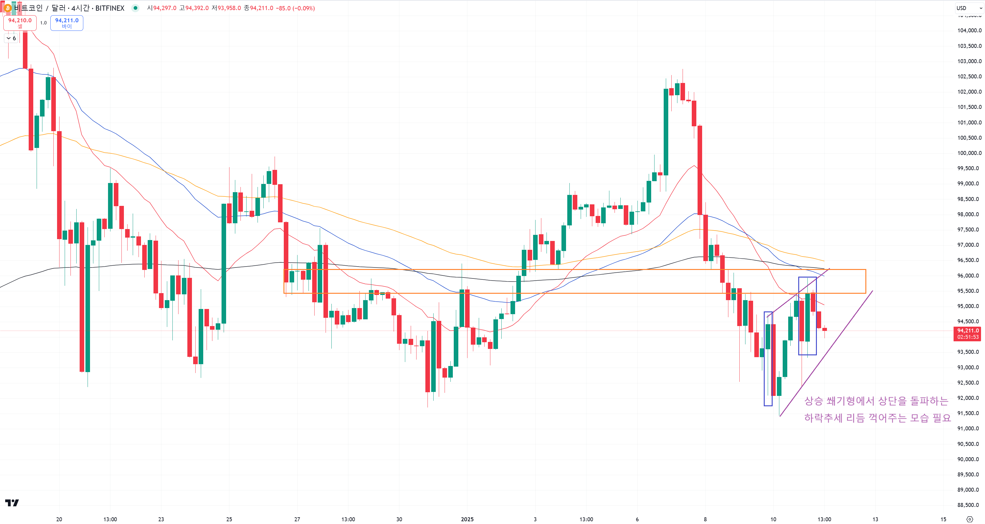 주황색 저항 구간을 돌파할때 상승쐐기 상단을 돌파해야하는데