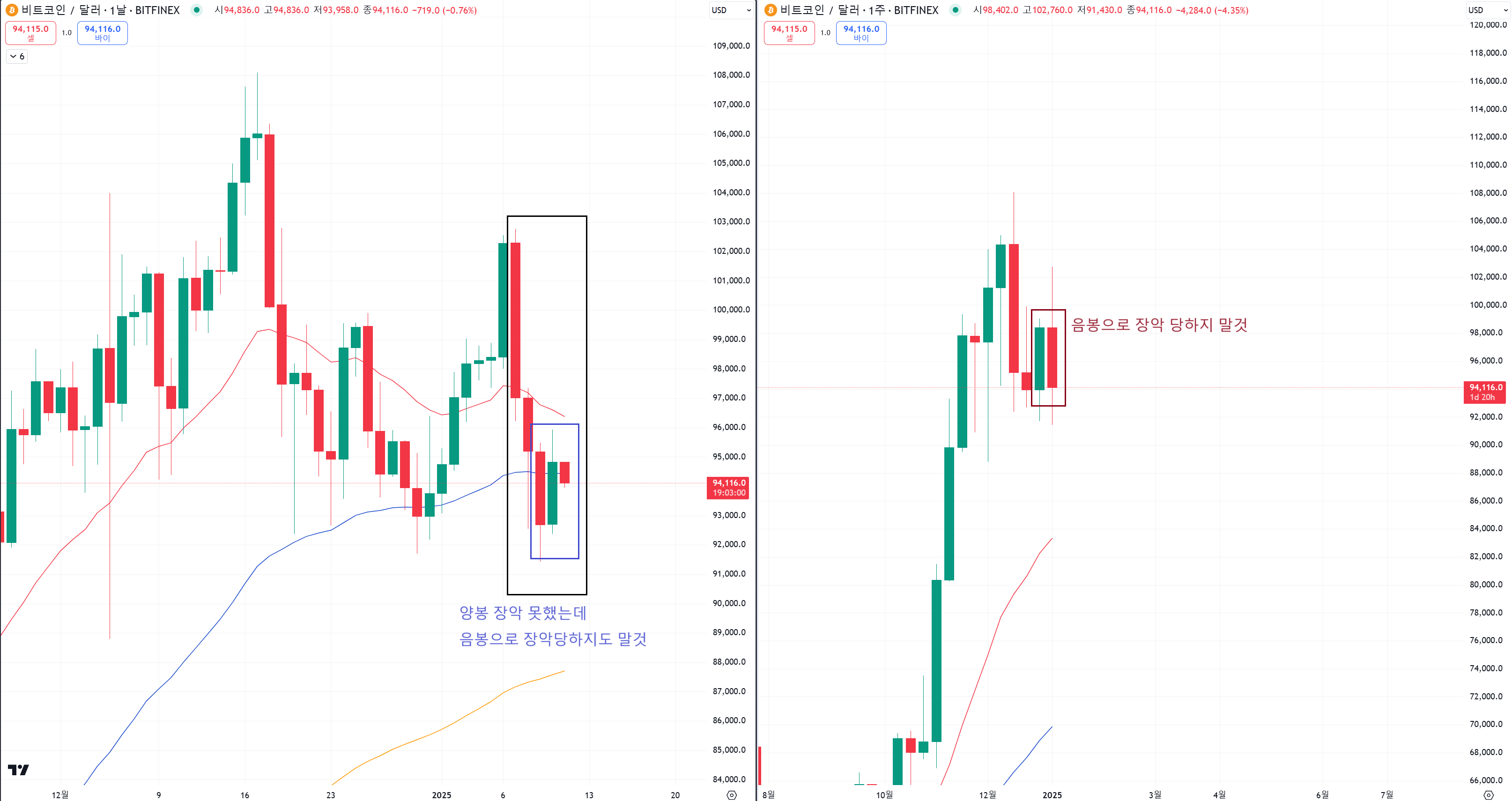 오른쪽 주봉차트에서도 음봉이 양봉을 장악해주는걸 막아줘야 합니다.