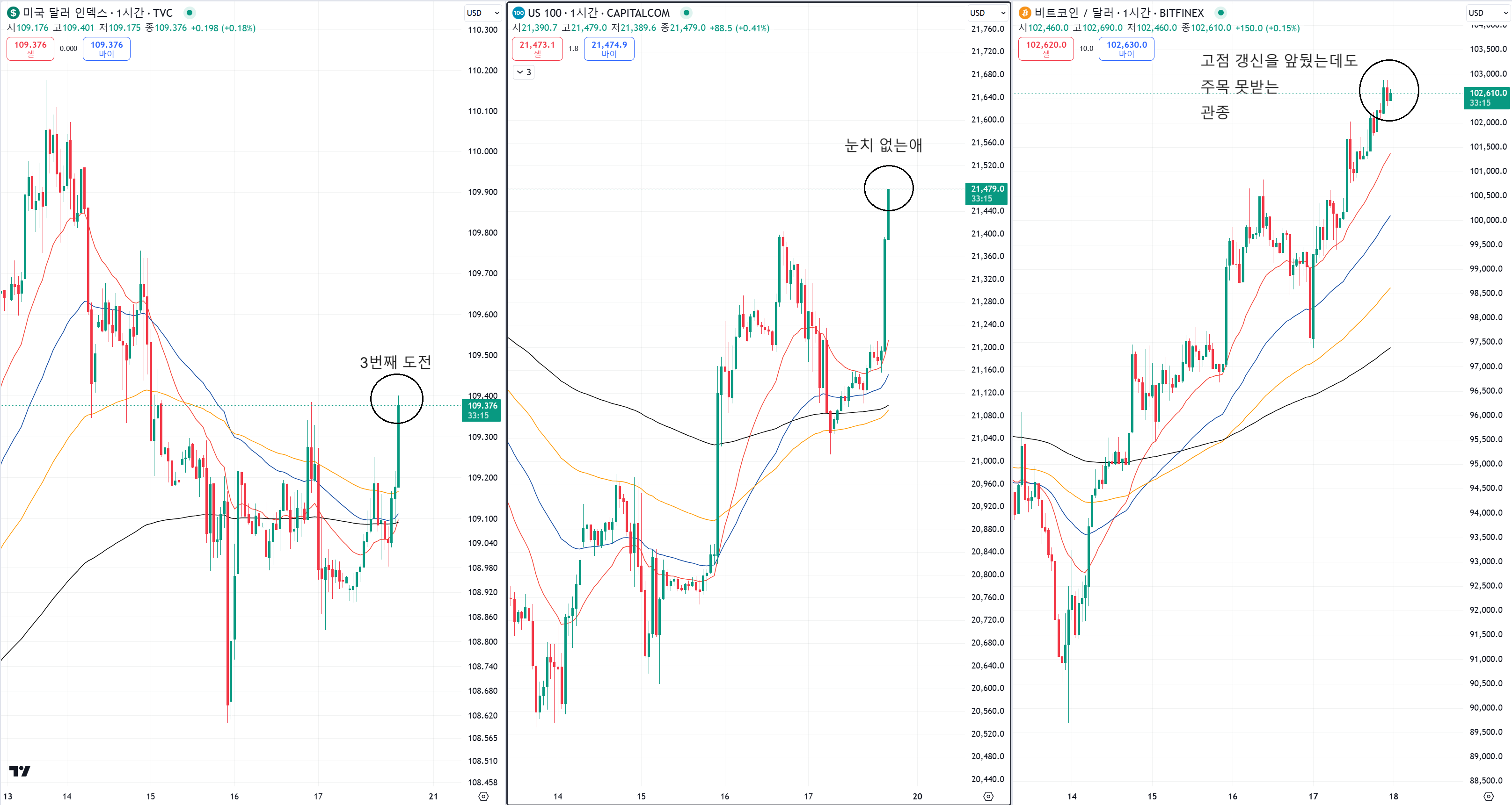 달라는 1시간봉이긴 해도 똑같은 저항 지점에서 3번째 도전을 하고 있는데
