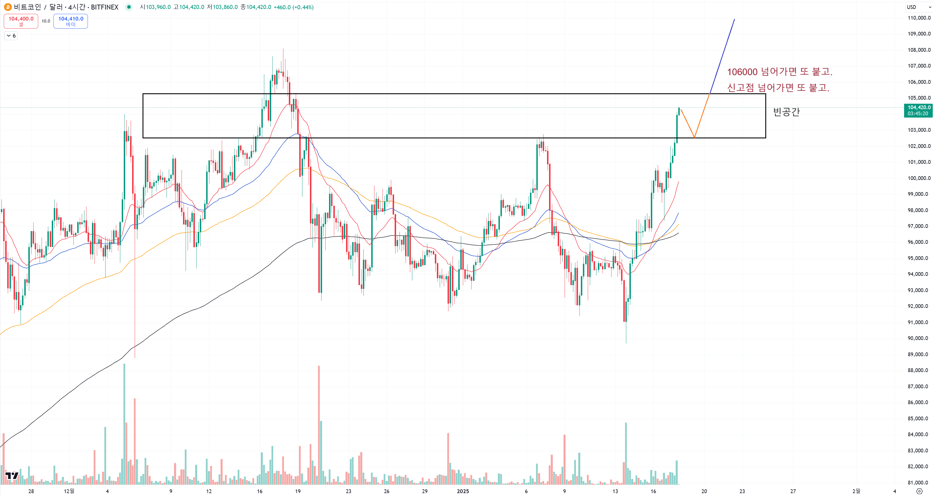 지금 위치에서 추가 상승을 해도 105000~6000에 저항선들이 존재해요.