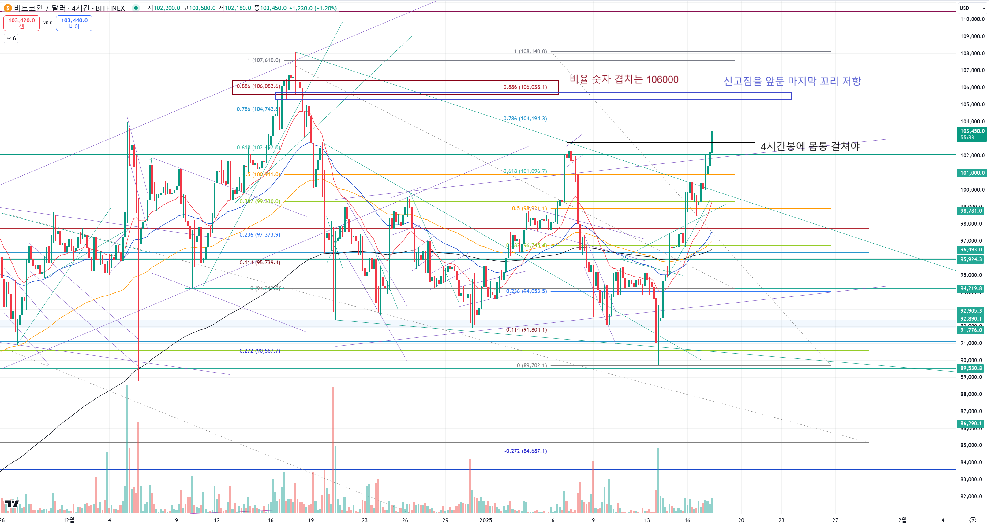 특히 106000은 피보나치 비율 0.886이 겹치는 곳입니다.