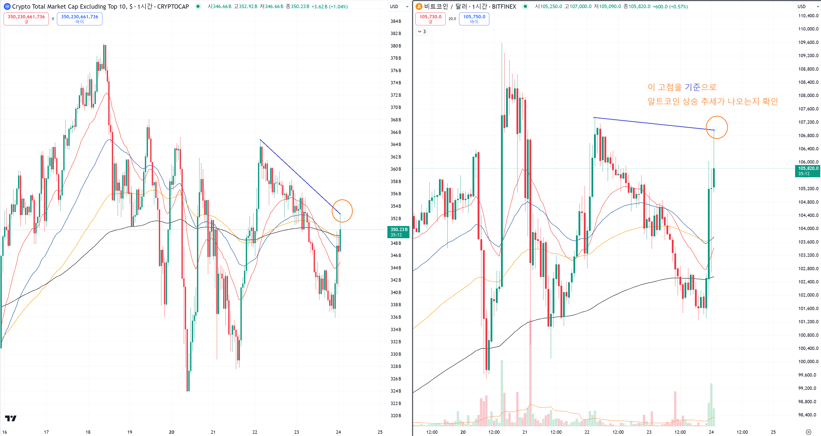 알트코인 시총이 따라잡을지 모습을 주황색 동그라미 고점 기준으로 확인하실 수 있을거예요.