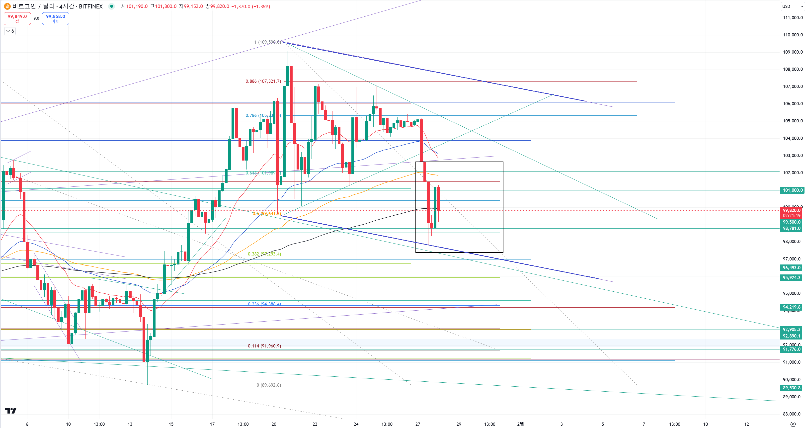 약 99500에 있는 이번 상승 추세의 전저점의 꼬리를 일봉 몸통이 장악해주면 안됩니다.