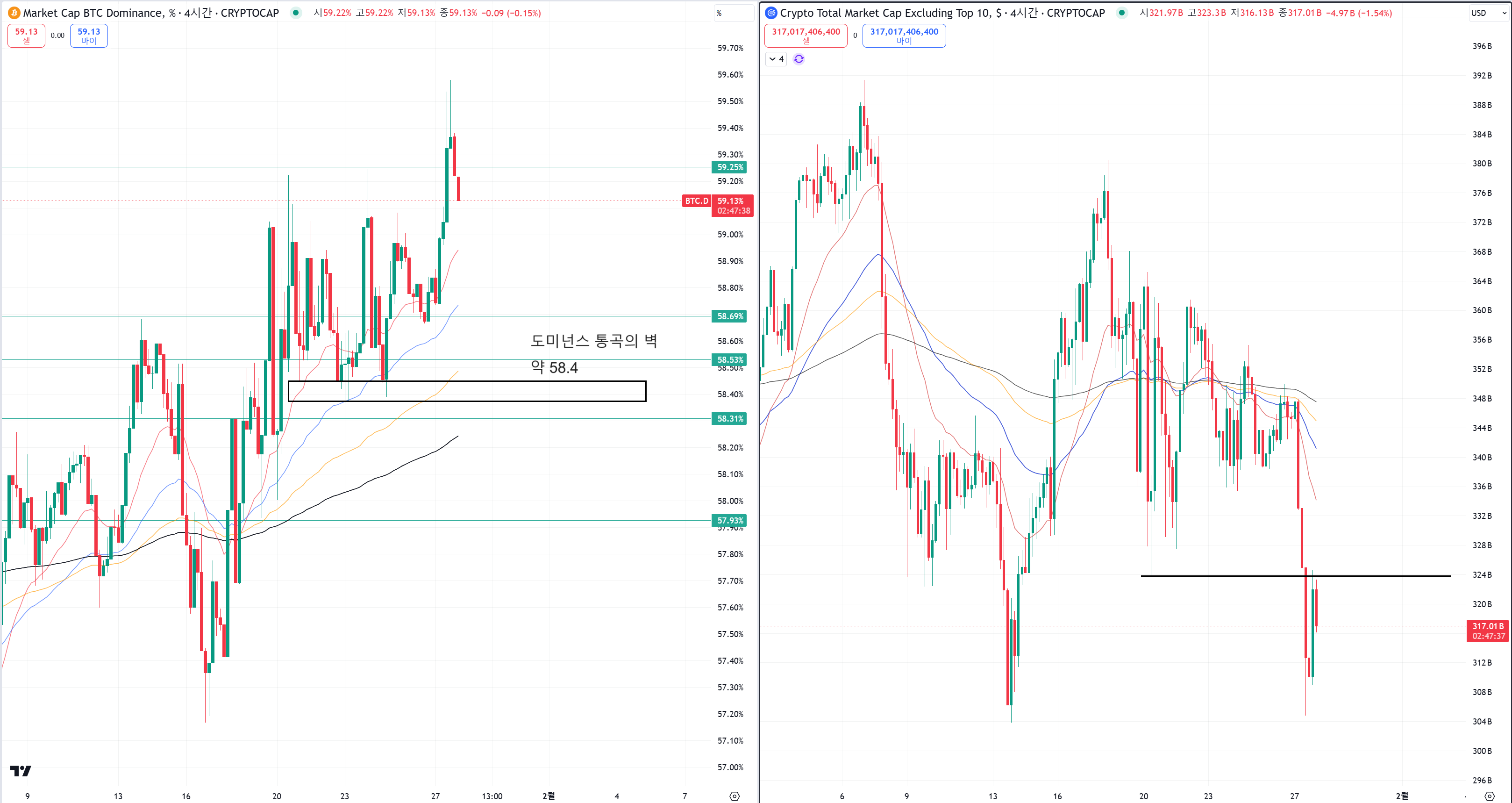 왼쪽 도미넌스를 보면 최근 58.4에서 반등이 3번이나 나왔어요.