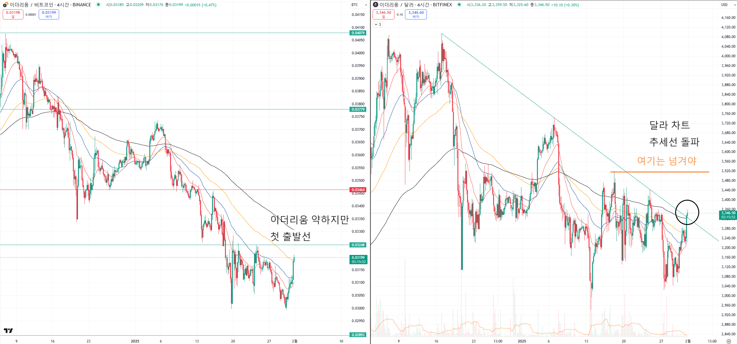 동시에 이더리움이 하락추세선도 넘어줬는데