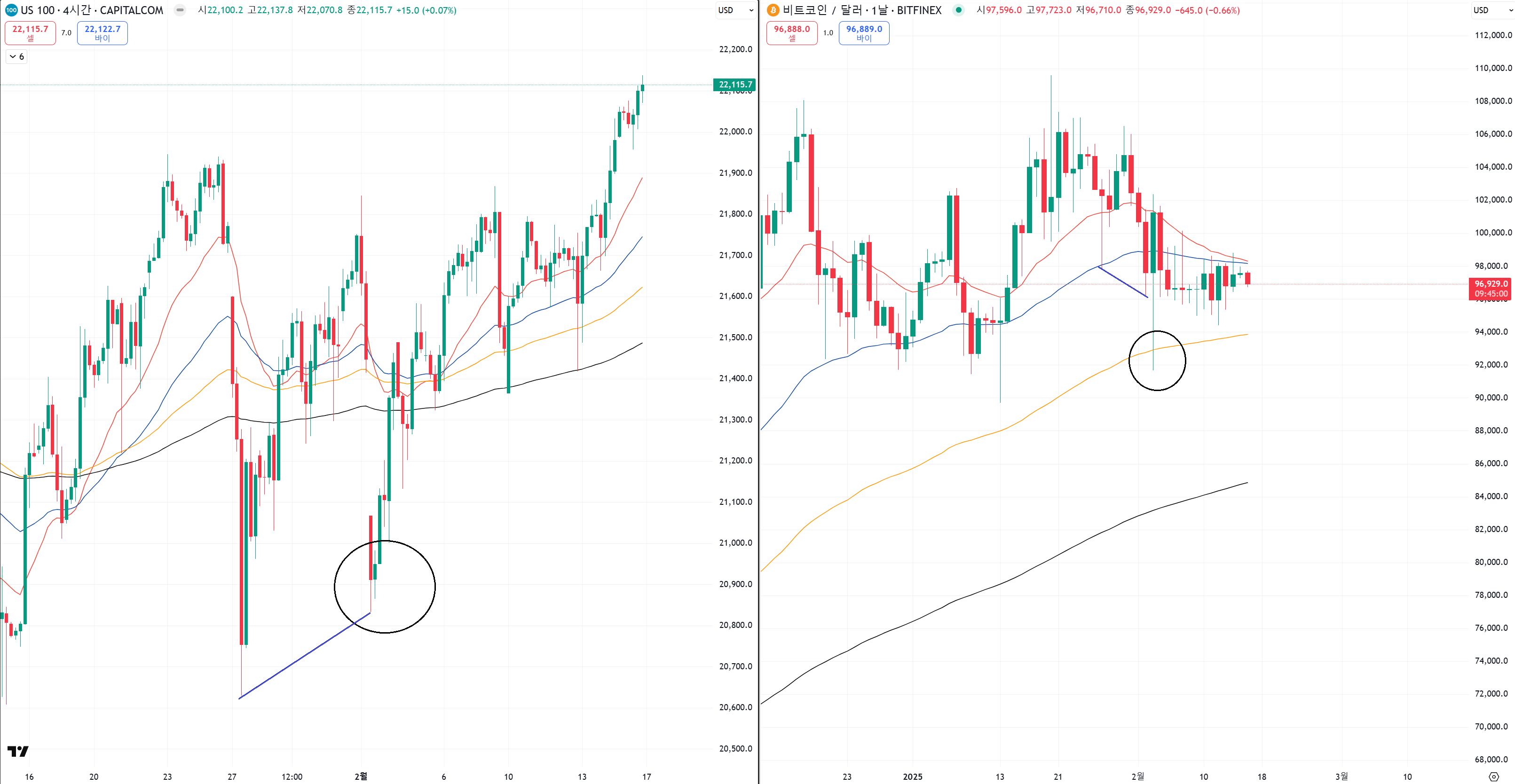 그것과 별개로 나스닥과 비트코인이 중요한 분기점에서는