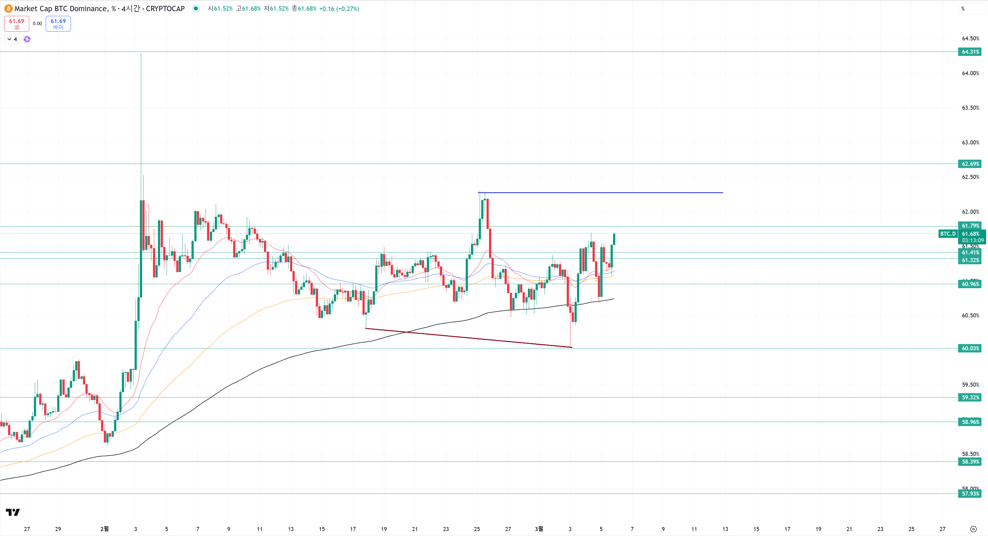 비트코인 도미넌스 동반상승이 나쁠게 없는건 도미넌스가 하락추세 확정으로 계속 내리는 중이거나
