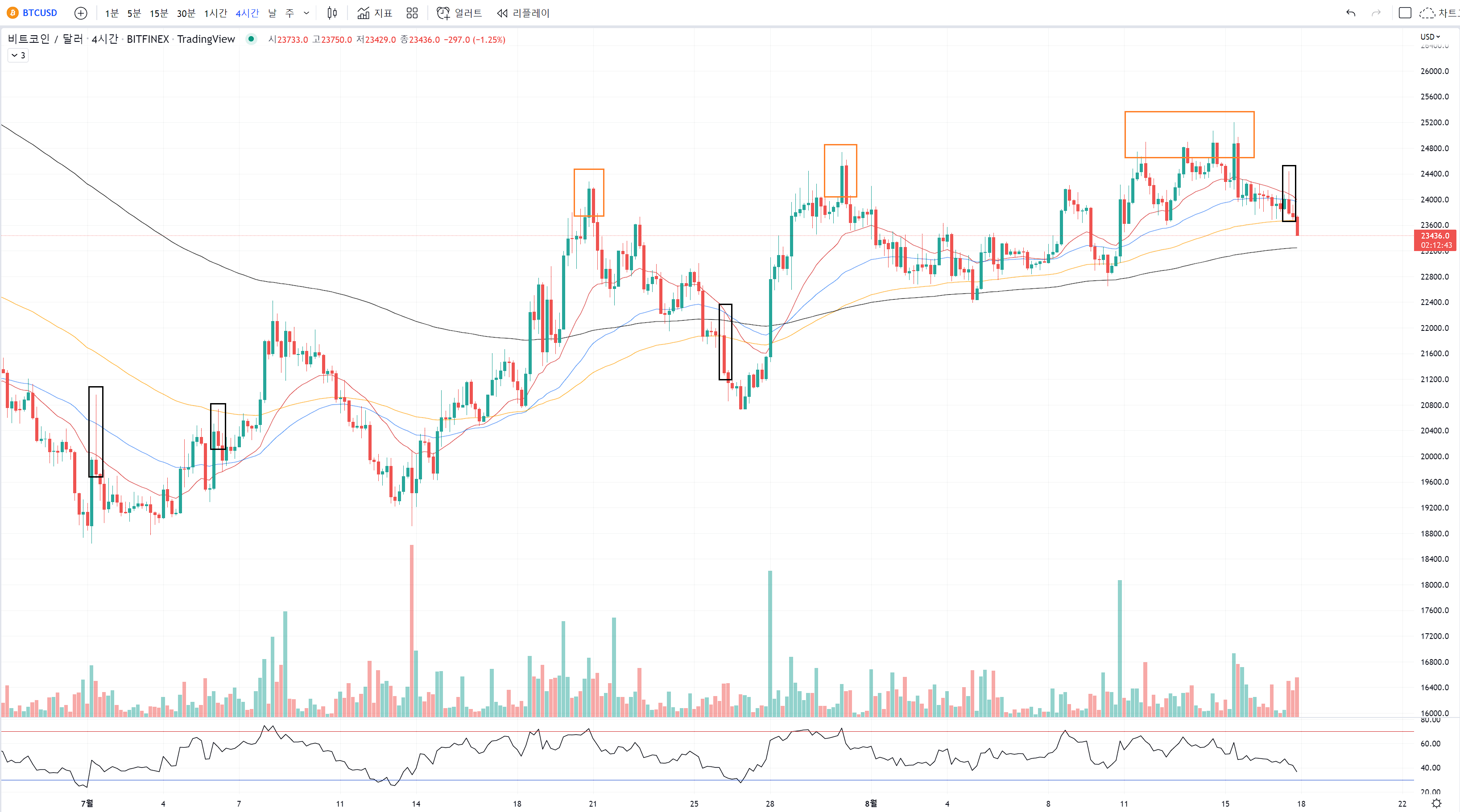 이번에도 올렸다 내리면서 4시간봉 캔들은 추세 반전 캔들의 음봉이 하락 이후 나왔습니다.