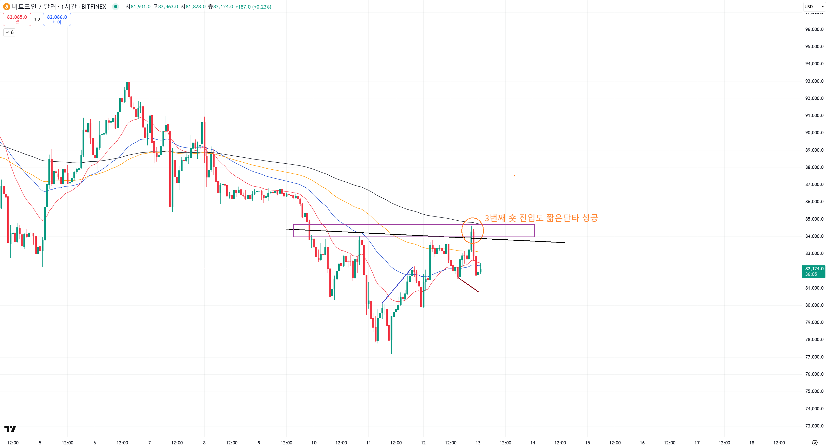 무지성 숏자리에서 3번이나 저항이 나오는건 반대로 3번째 상승 도전 실패도 의미합니다.