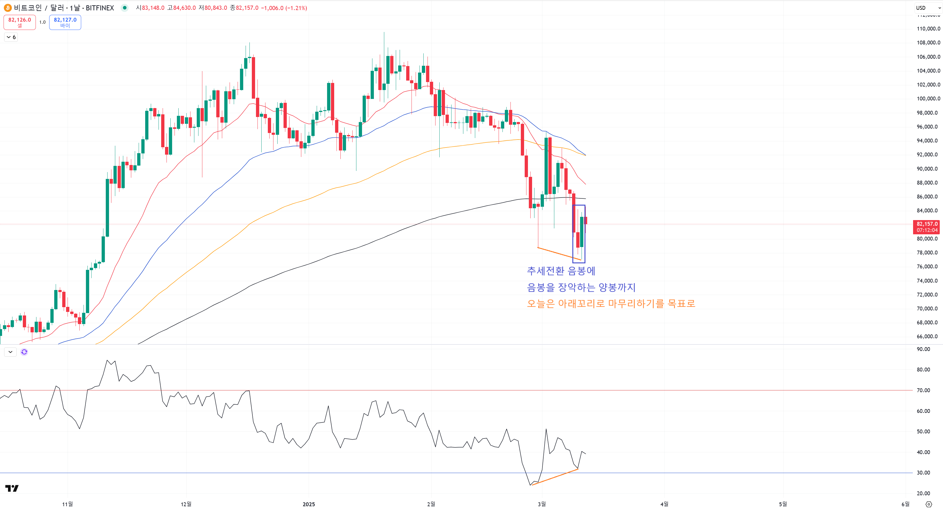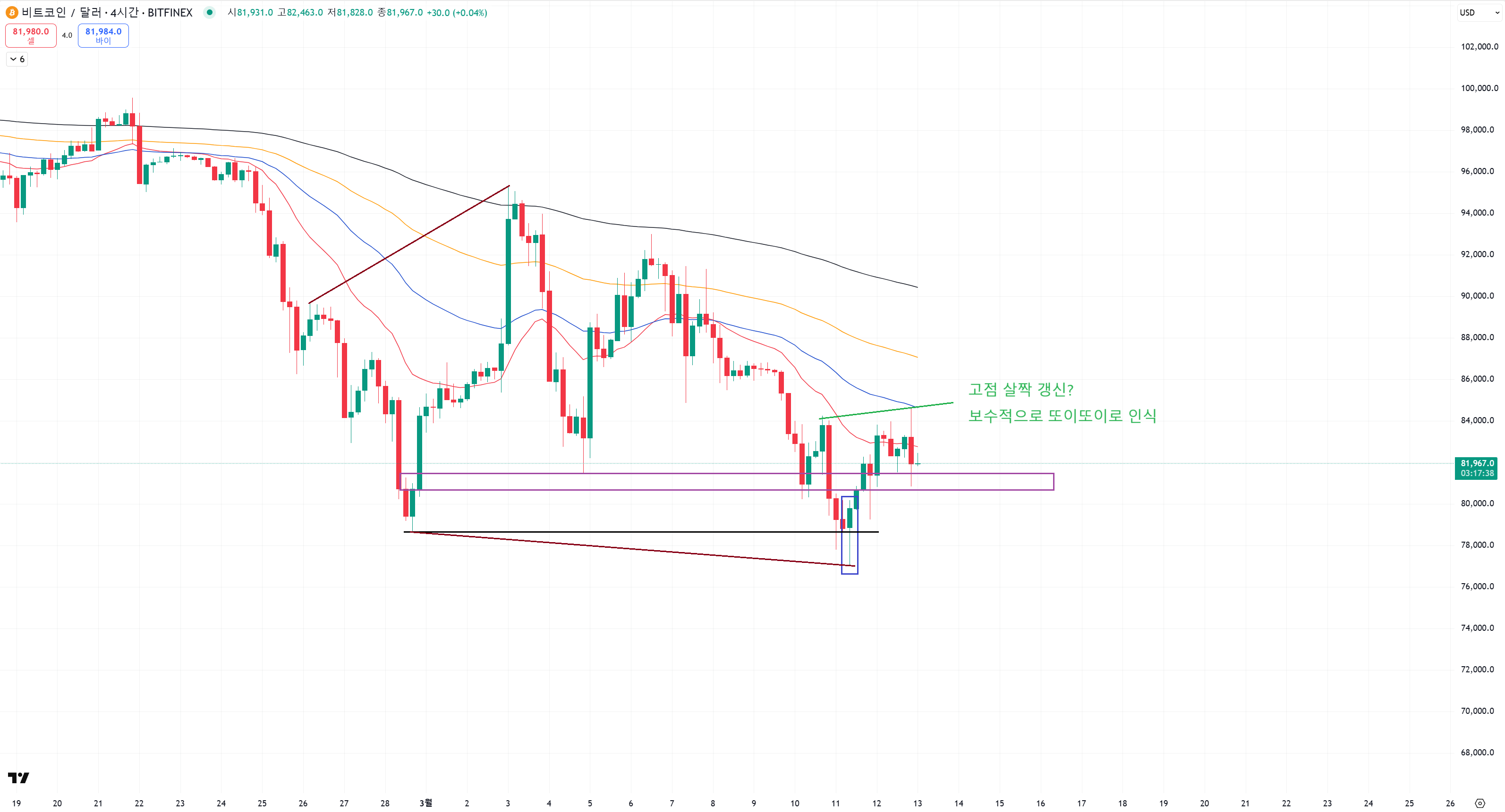 이걸 막으려면 3월 3일의 고점을 장대양봉으로 돌파해서 숏청산을 내야만 추격매수를 노릴 수 있고