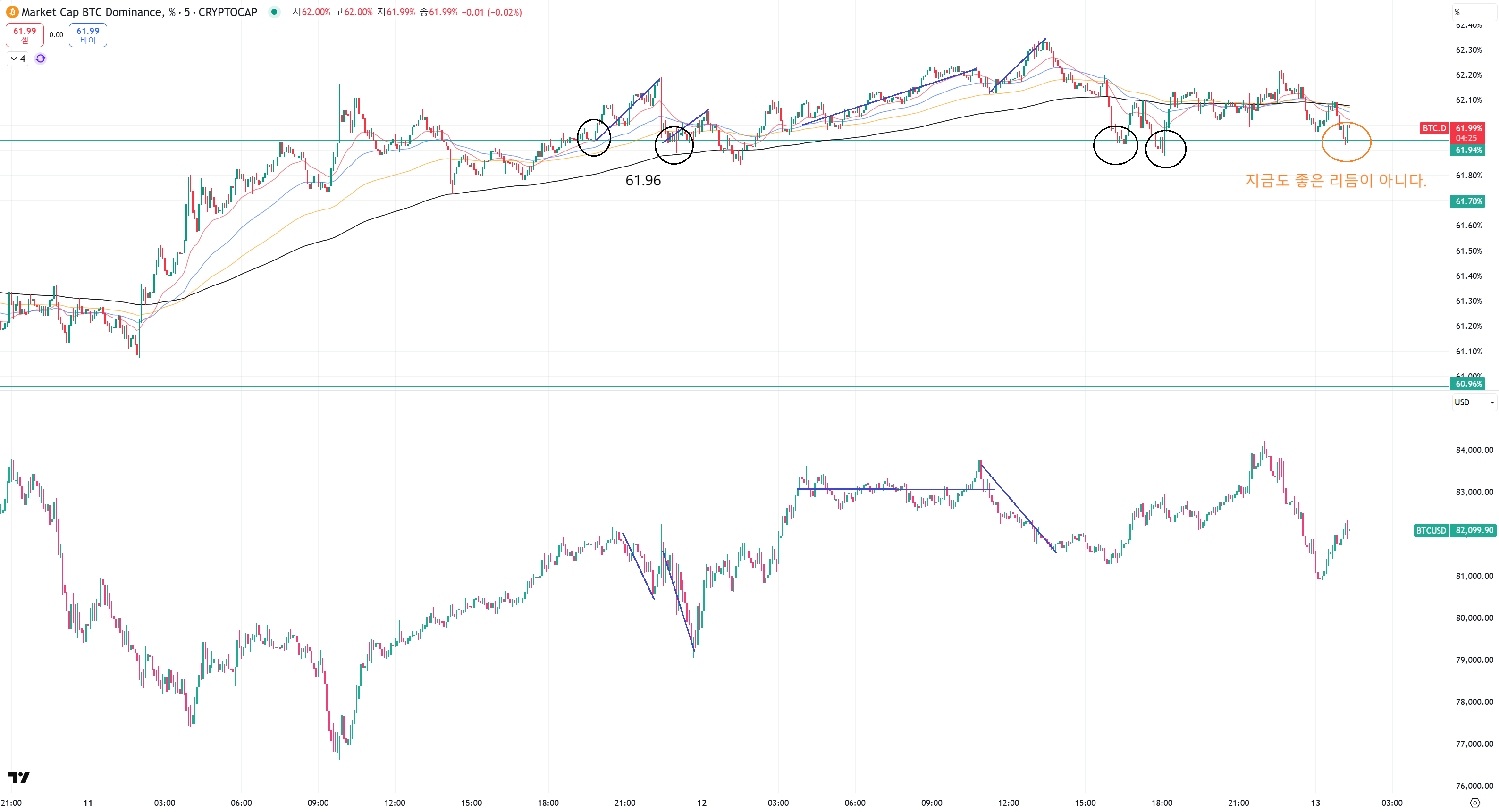 단기적으로라도 매수세를 다시 붙이려면 도미넌스 61.96이 무너지면서 비트코인이 상승 모습을 보여줘야 하는데