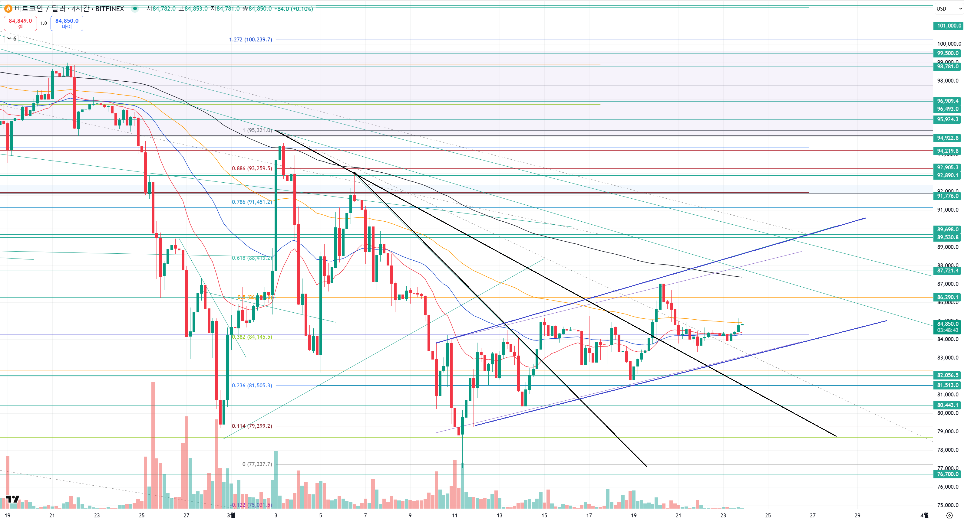 지금 차트는 3월동안의 모습을 1시간봉으로 본거지만