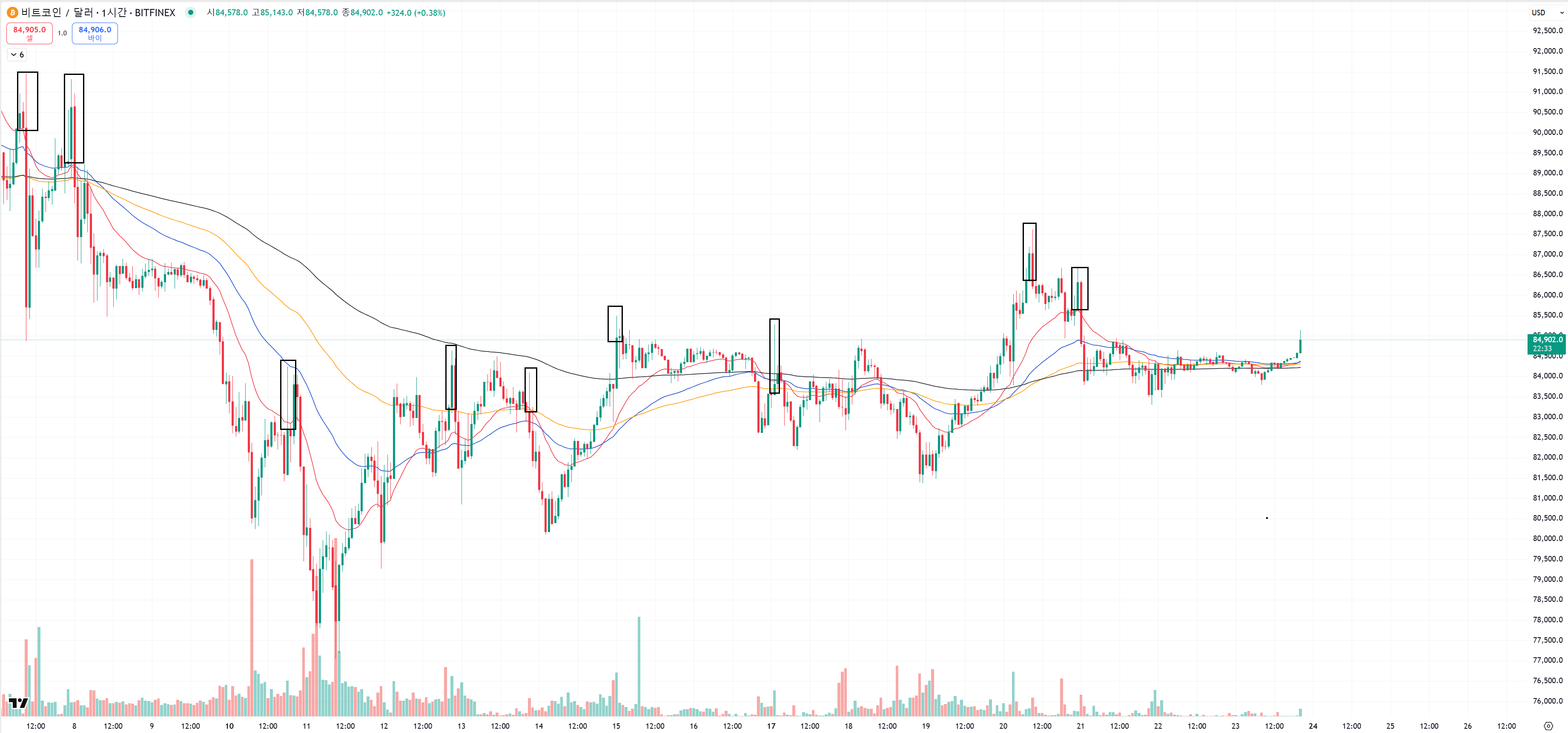 검은색으로 표시한 지점들을 분봉단위에서 볼 수 있으면 확인해 보시고