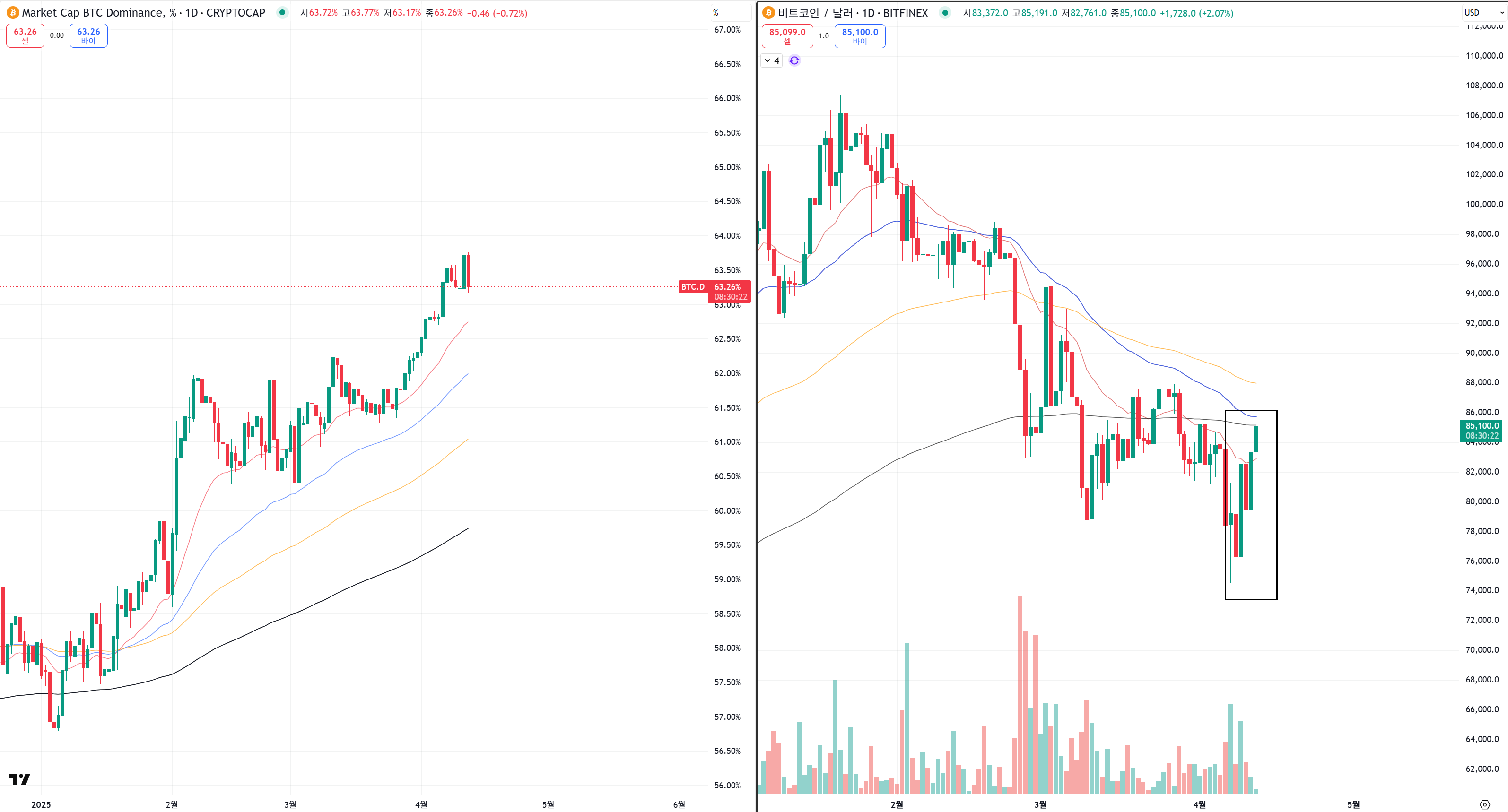 25년 1월부터 4월 현재까지도 도미넌스가 꾸역꾸역 상승하면서 코인시장에서 돈이 빠져나가는 모습입니다.