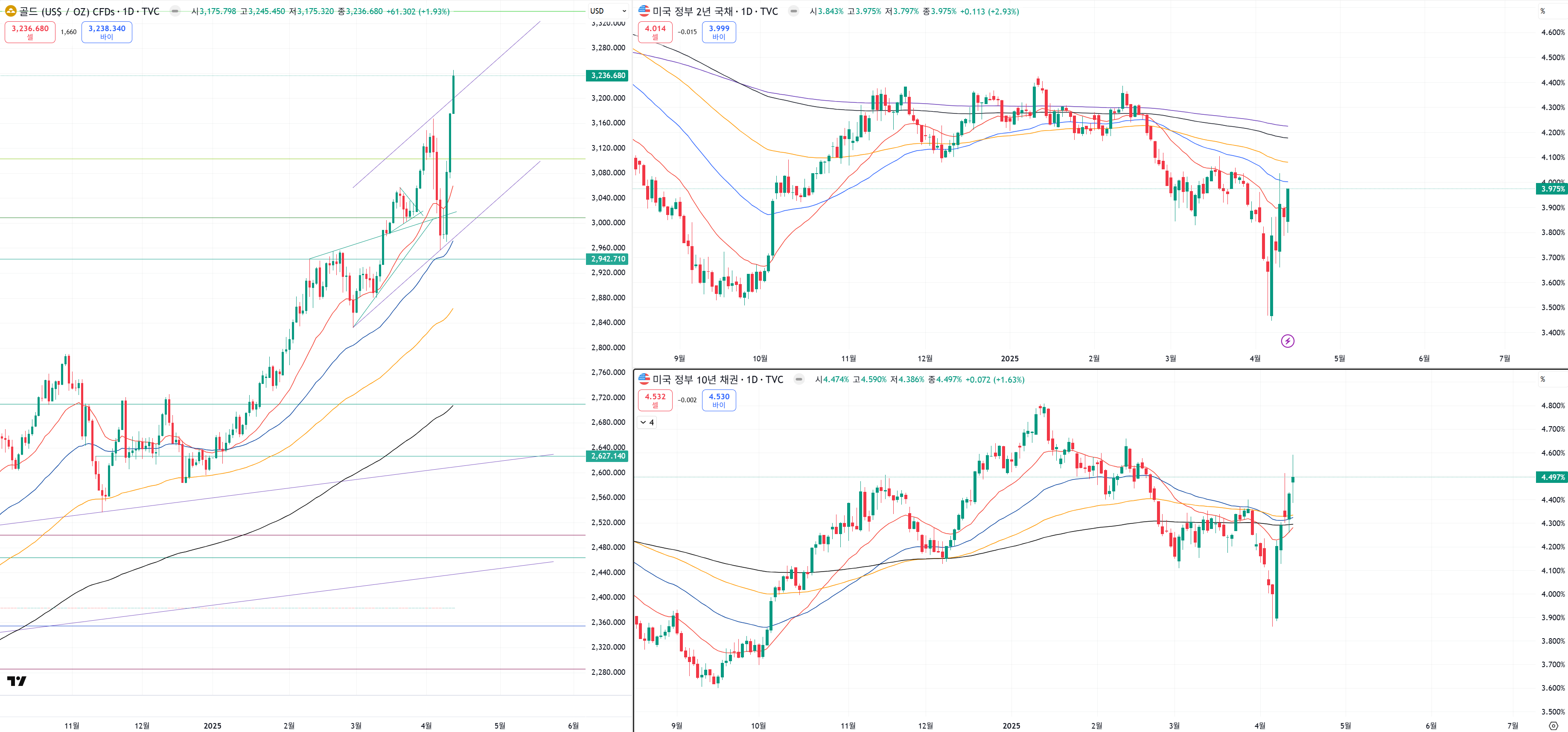 왼쪽은 골드차트, 오른쪽은 미국 채권 2년물 10년물의 금리입니다.