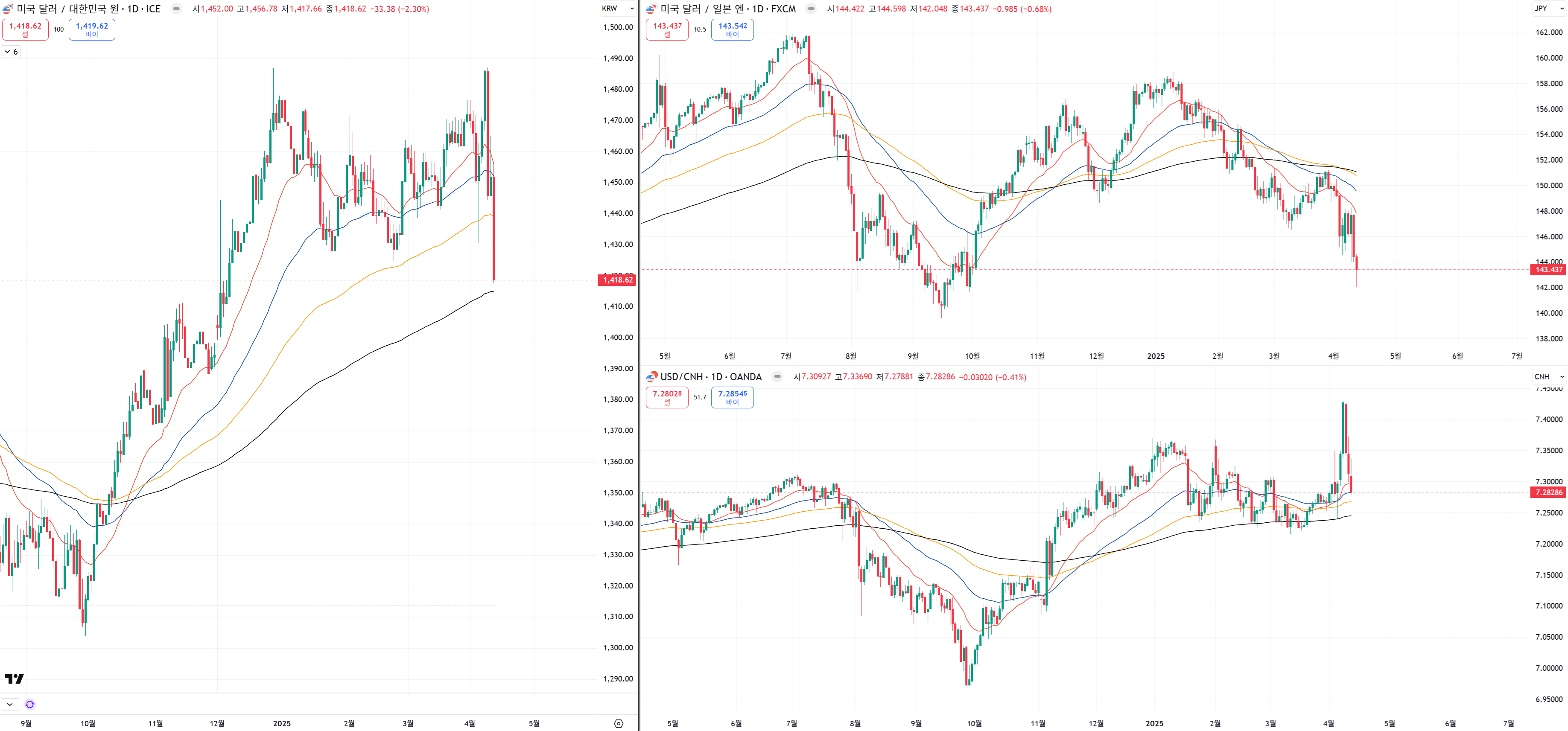 왼쪽이 달라원 한국 환율 차트이고 오른쪽은 엔화와 위안 차트입니다.