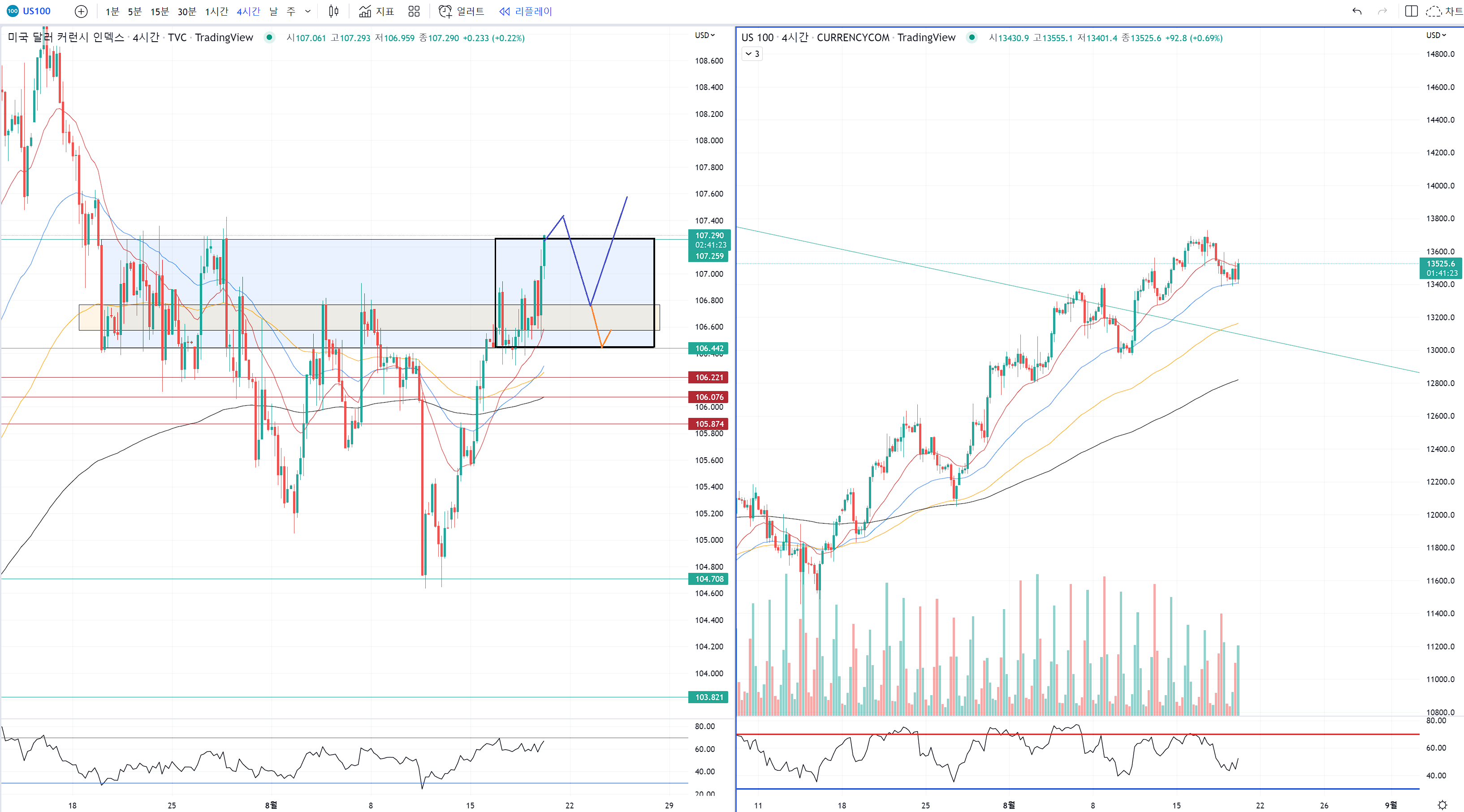 그리고 지금 달라가 상단을 도달했을때 나스닥이 13500이란걸 기억하세요.