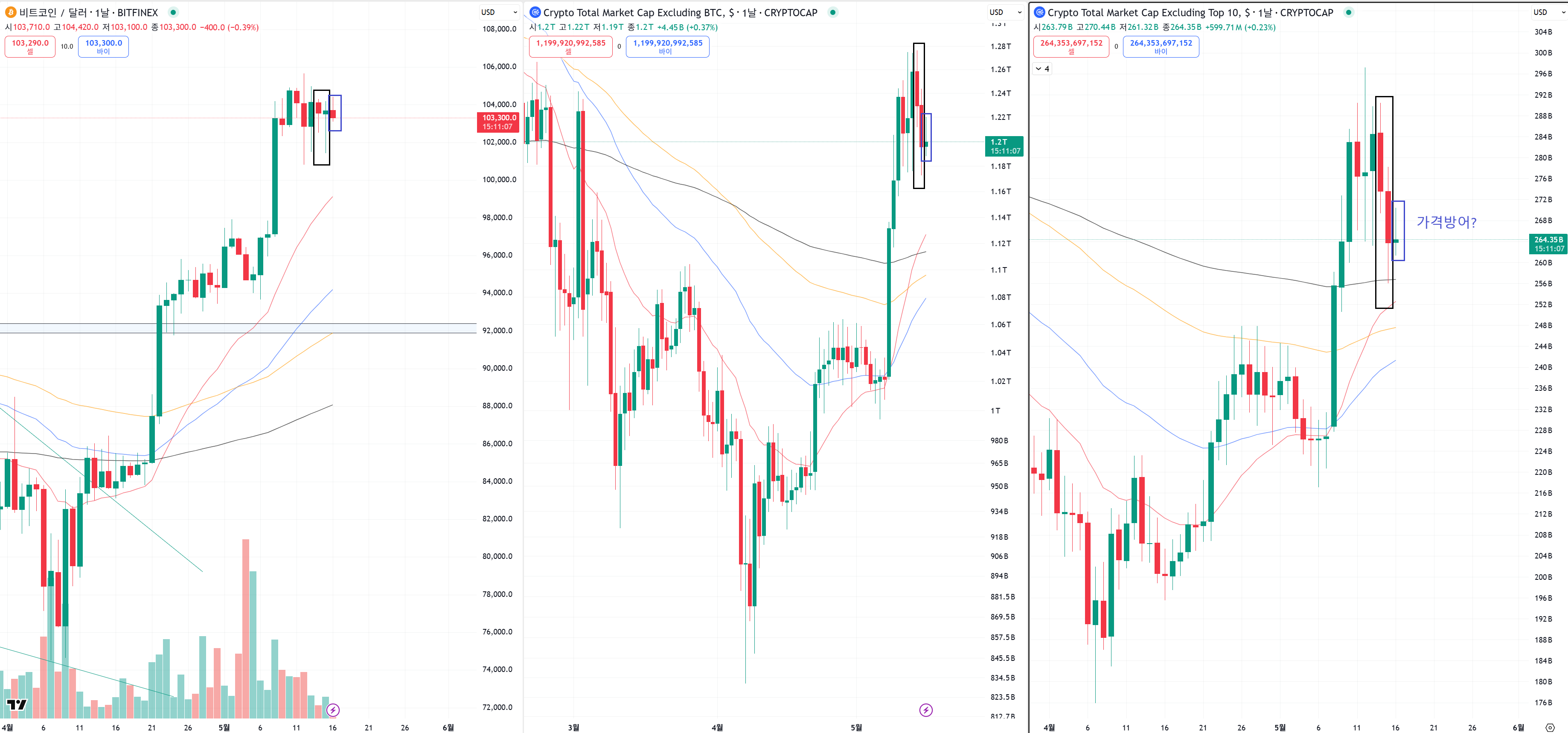 비트코인은 음봉이지만 알트코인 시총은 양봉이예요.