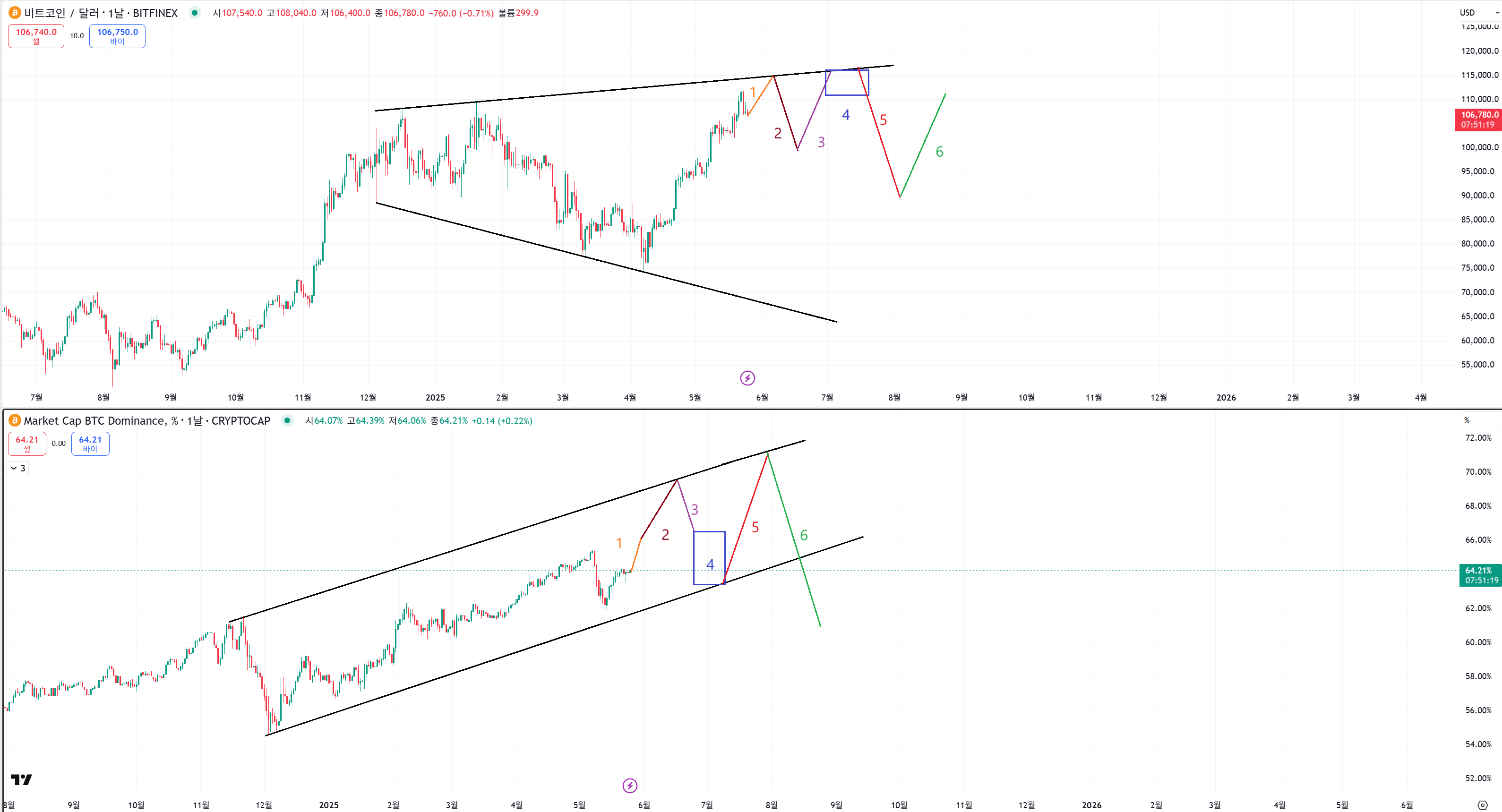 주황색선처럼 고점을 한번 높인 이후 다시 도미넌스 하락이 나올때