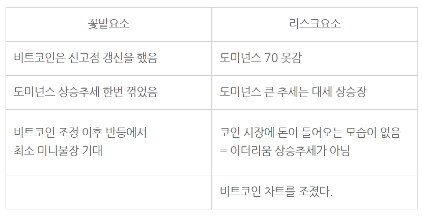 이제 정말 리스크는 비트코인 차트 망쳤다와 도미넌스 70 못갔다 밖에 없어요.