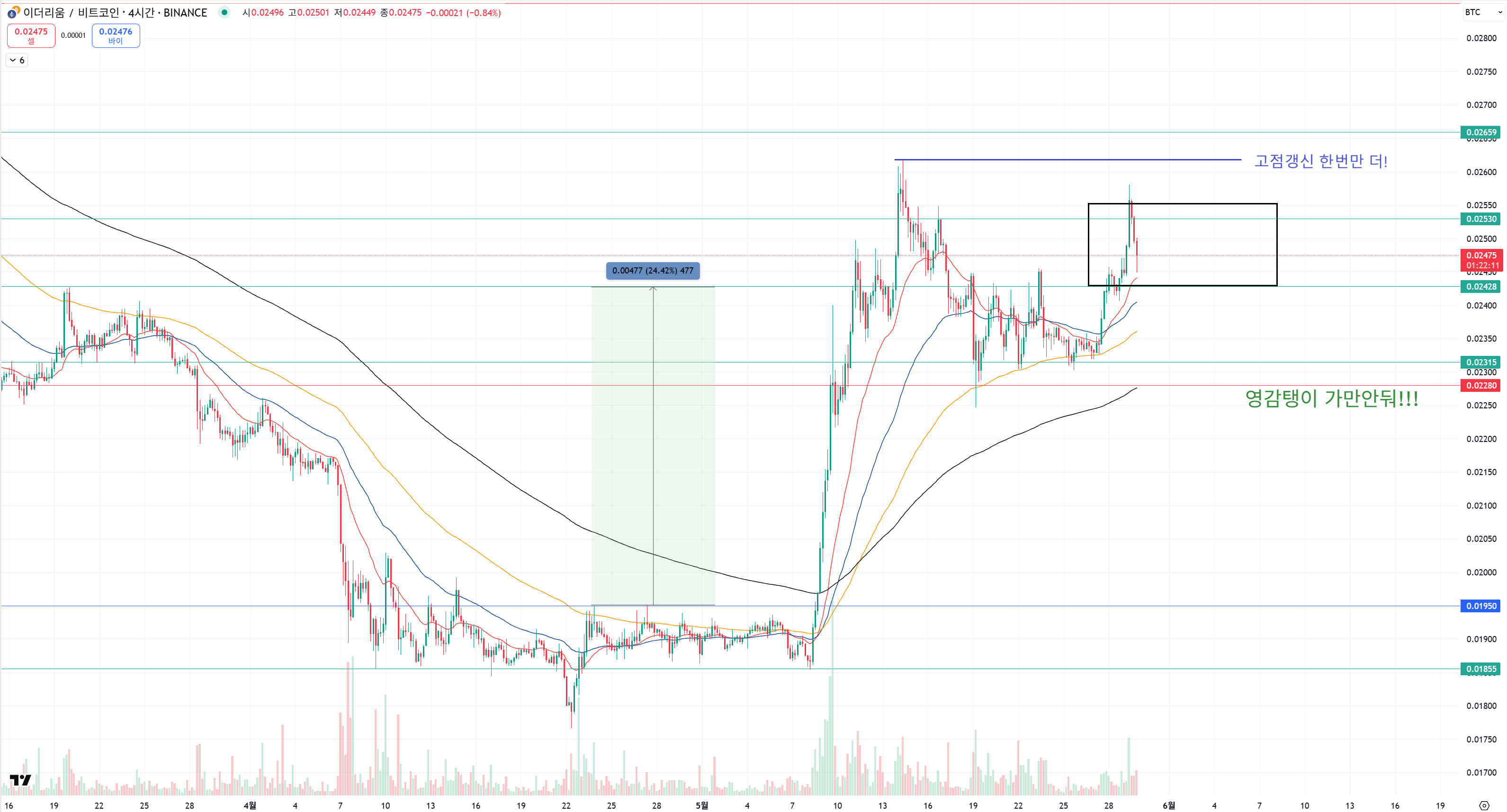 비트코인 조정 횡보하는 사이에 이더리움은 영차영차로 상승 횡보를 해주고 있습니다.
