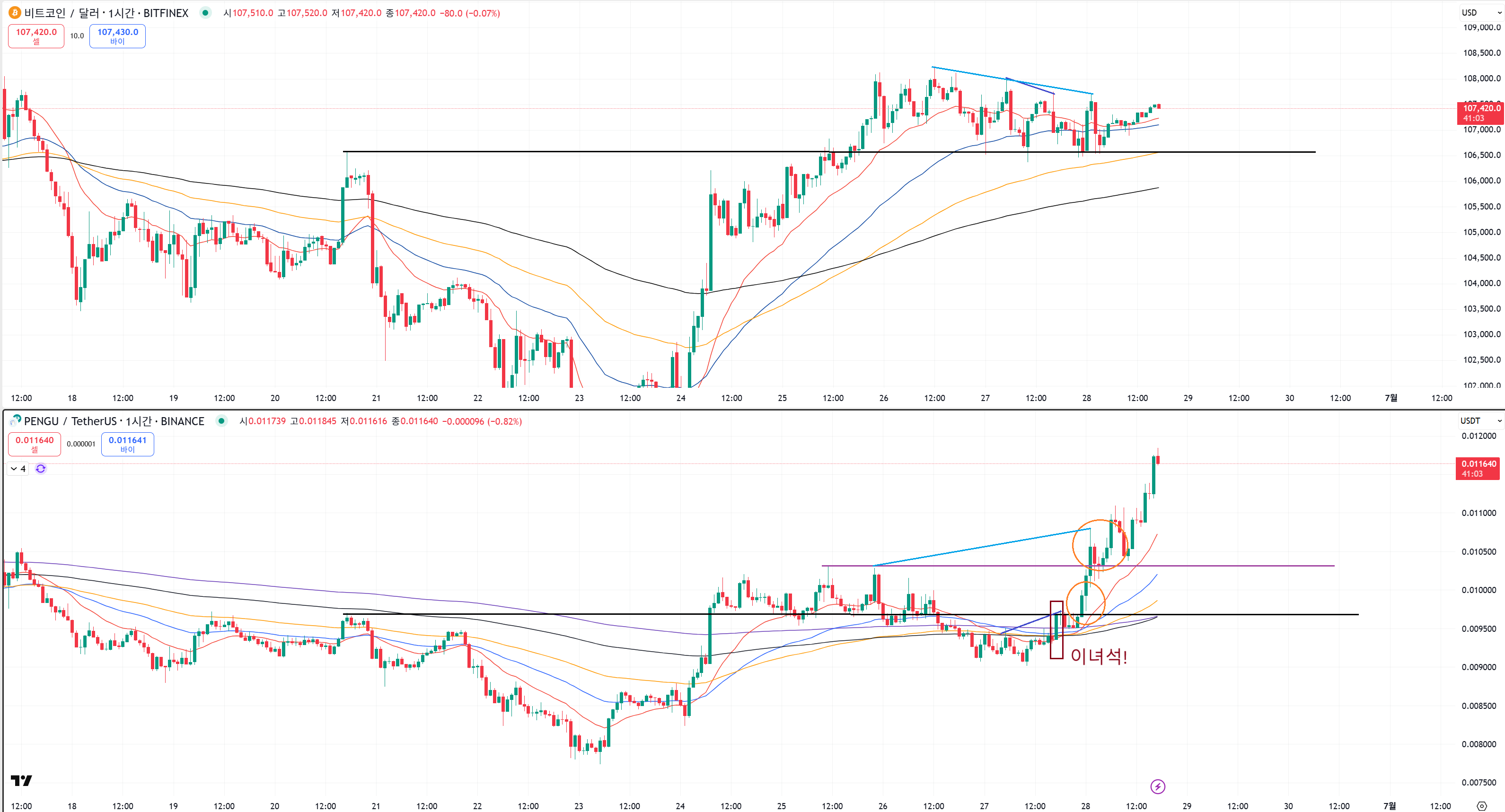 하늘색선을 보면 비트코인 전고점 갱신 못하는데 펭귄은 갱신하면서