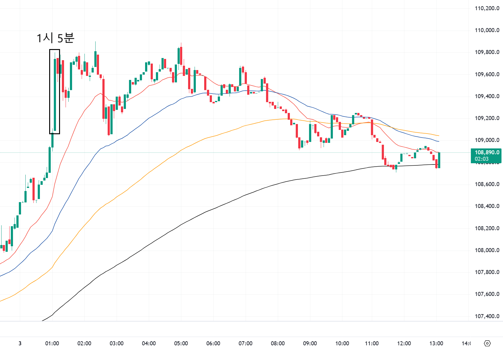 비트코인 기준으로는 1시 8분에 도달했었어요.