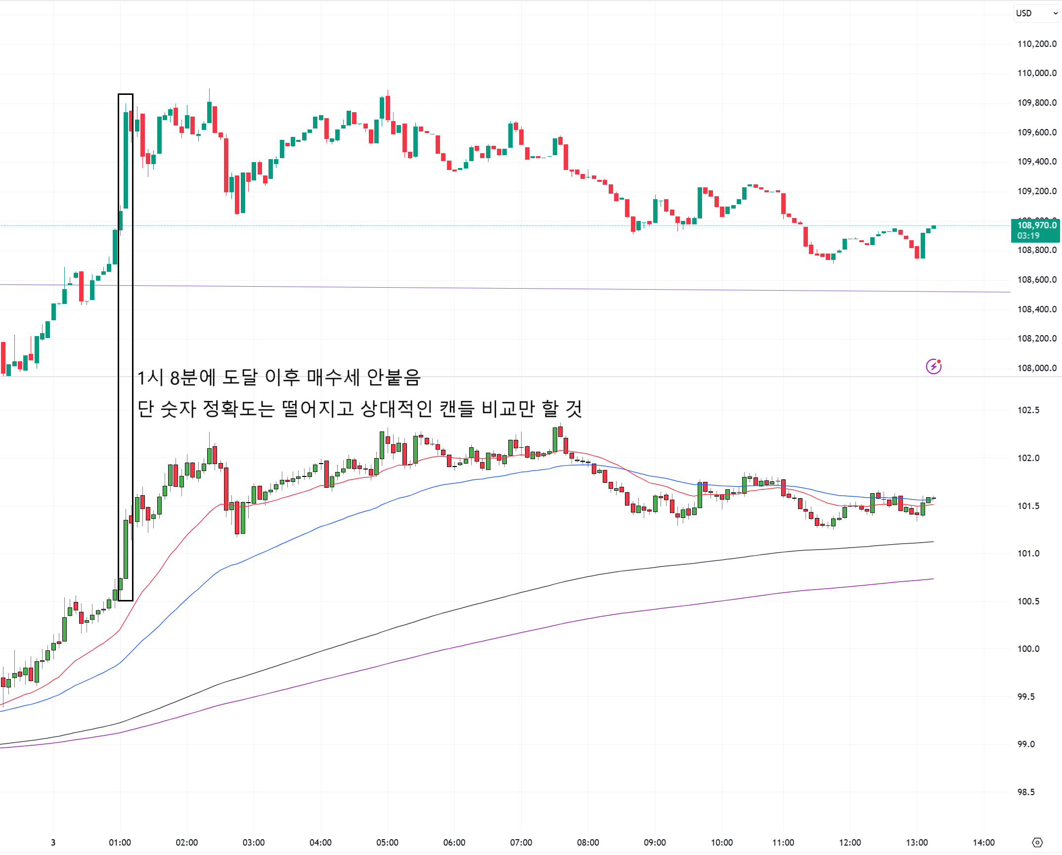 어제 1시였을때를 보면 확실히 1시 8분 도달 시점에 비트코인 매수세가 뚝 끊기는걸 보실 수 있습니다.