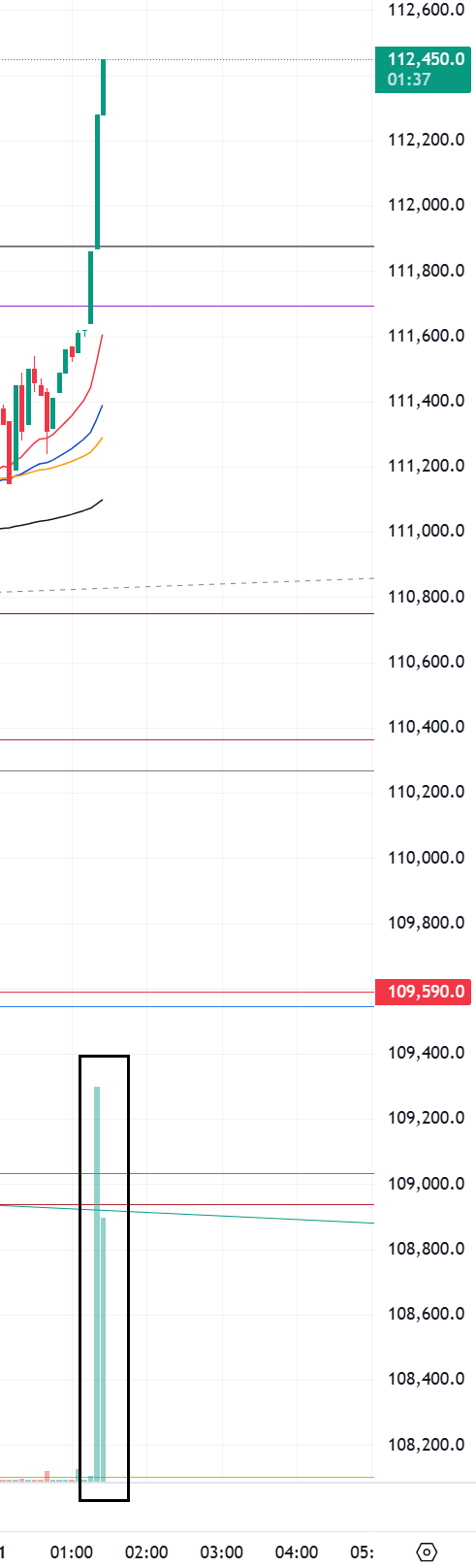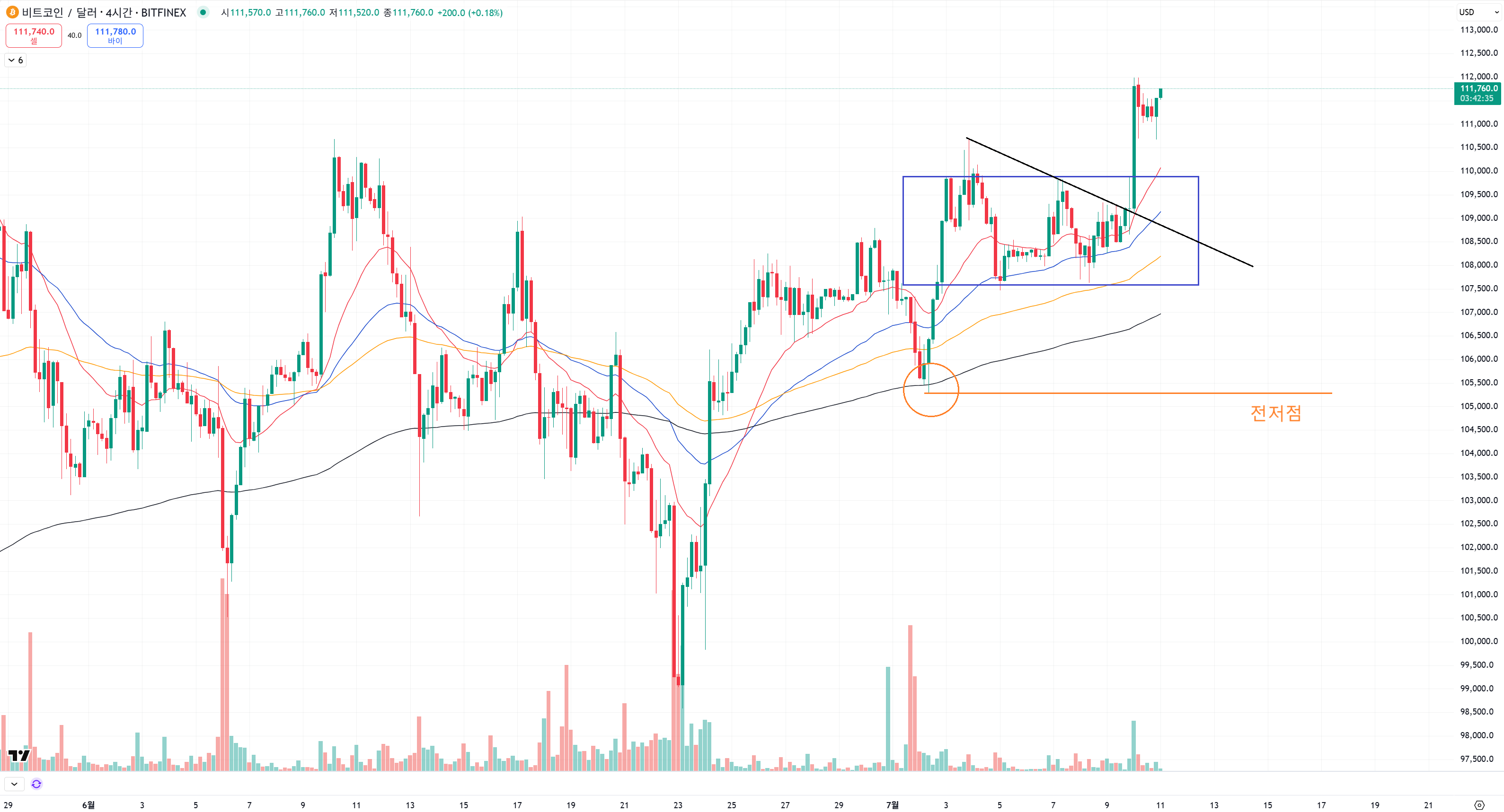 어제 박스권 상단인 110700을 넘어간 시점에서는