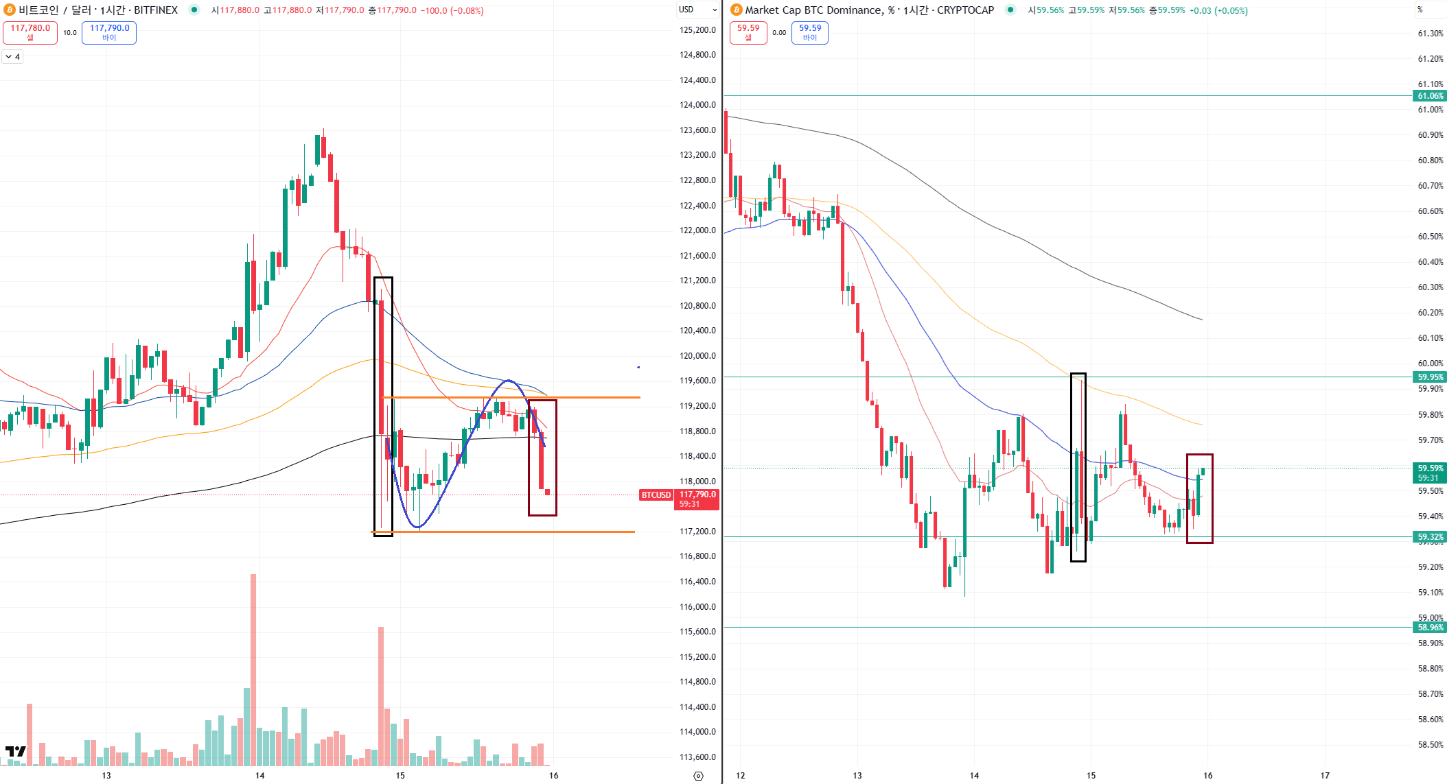 비트코인이 추가적으로 하락을 하는데 도미넌스도 하락하면서