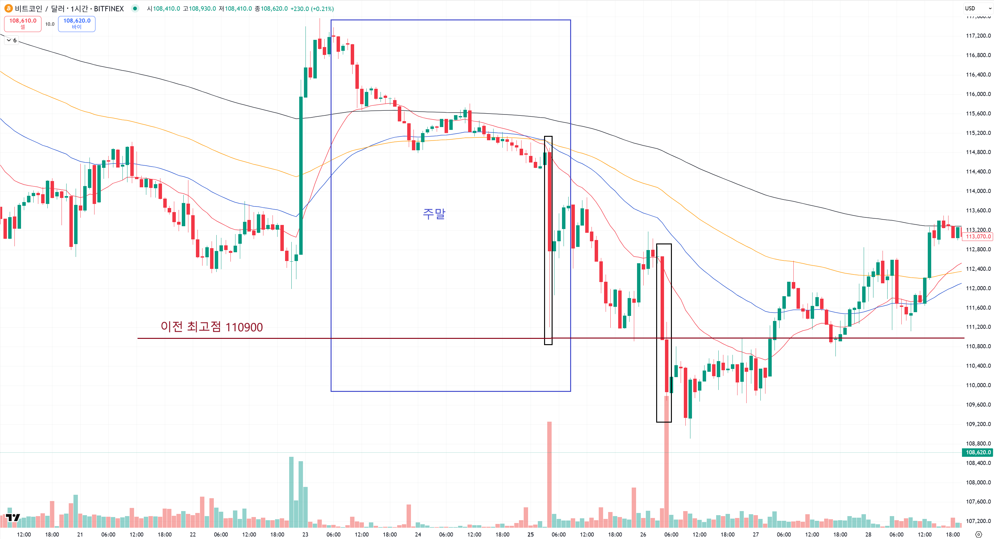 특히 이 과정에서 중요한건 이번 상승장 전체적으로 볼때 이전 최고점인 111900까지 무너뜨렸다는거죠.