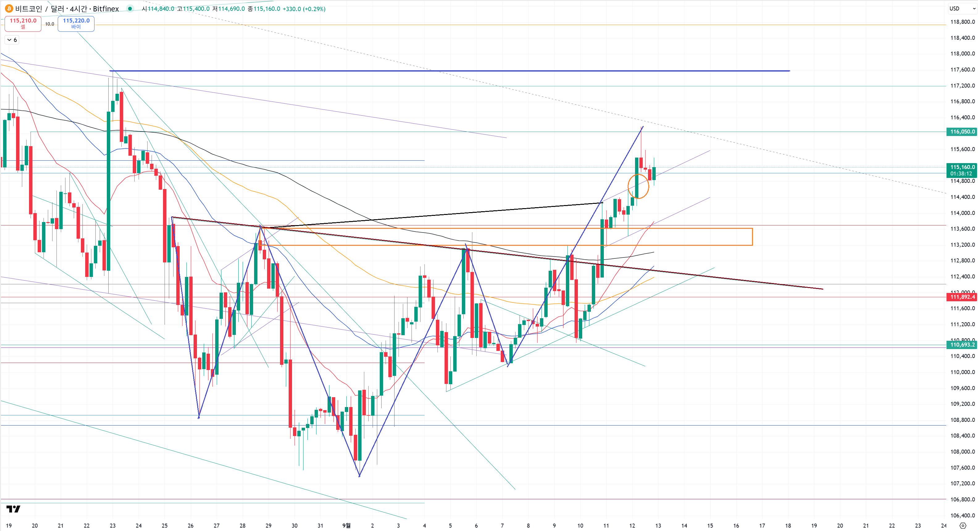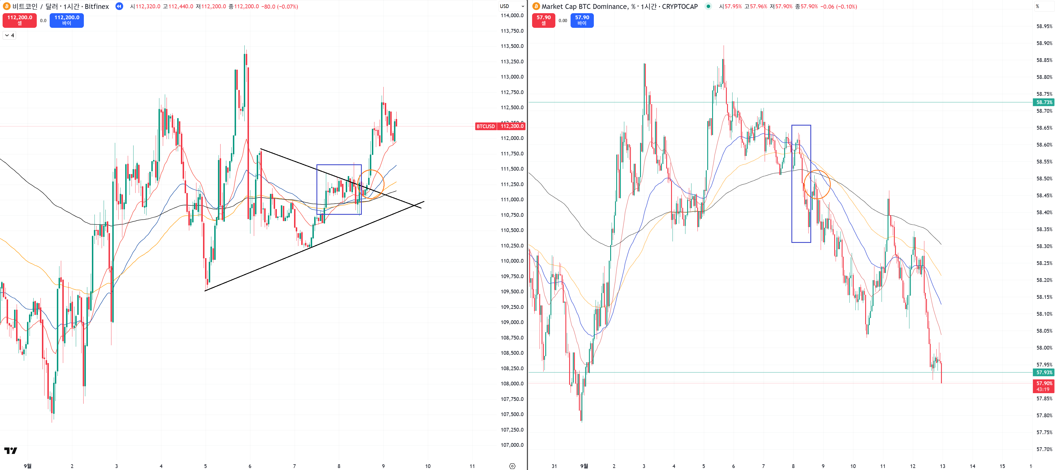 삼각수렴 상단 이탈입니다.일봉이나 주봉 마무리는 별로고 도미넌스도 기어이 58.34에서 또 반등이라 안좋지만알트코인쪽 리듬이 좋기 때문에이번 상승으로 제대로 돌파를 노려보되이번에도 밀리면 한번 크게 하락할 수 있어요.이번에 상승한다면 113600인 전고점은 꼭 갱신해야합니다.그 자리가 분기점이예요.