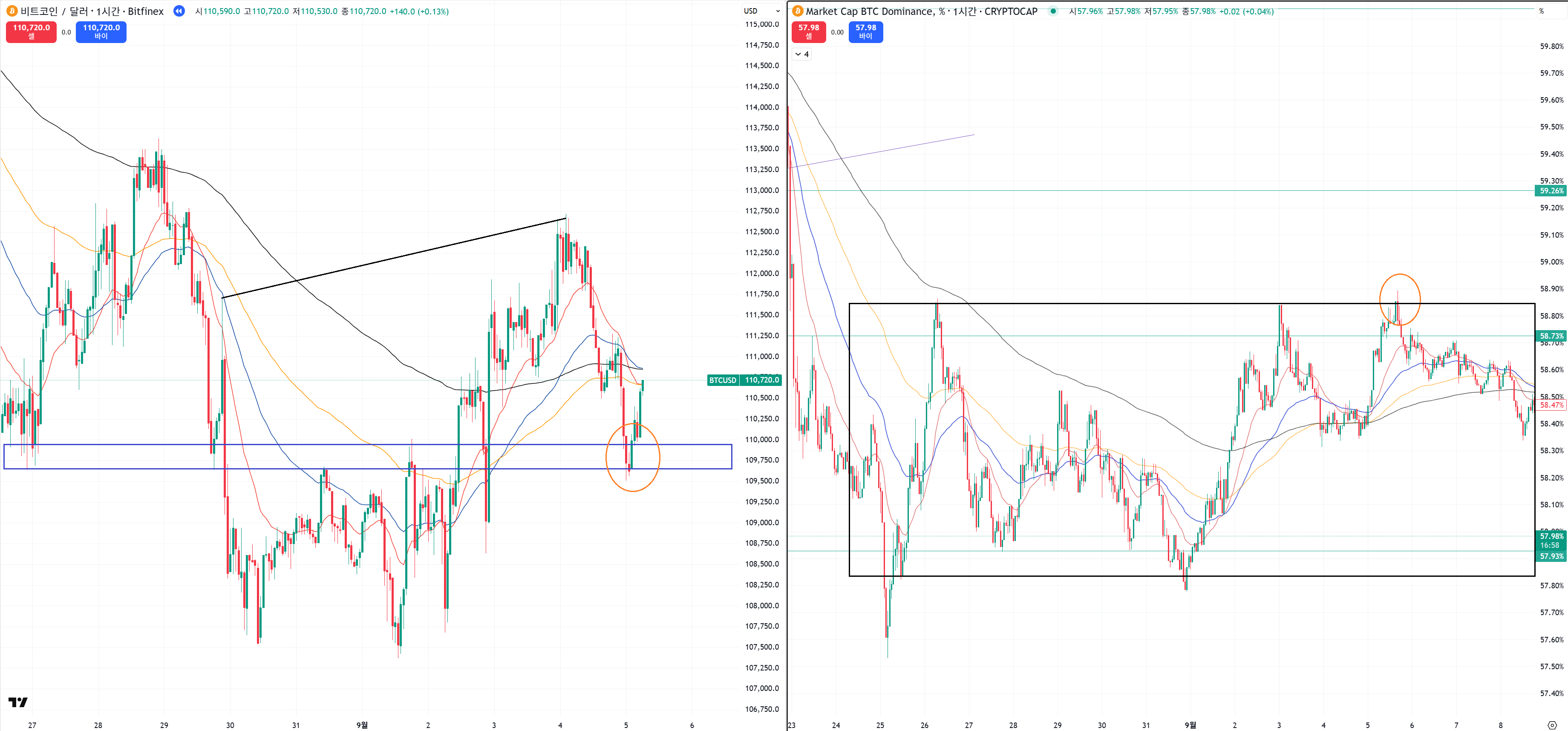 비트코인은 나스닥 상승에 억지로 끌려가는 느낌인데다어제에 이어 오늘도 알트코인 돈이 빠져나가는 모습이긴한데도미넌스 57.93 - 58.73 여기 박스권은 지겹도록 지켜주고 있네요.아마 복잡한 프로그램도 아니고 그냥 컴퓨터로 입력만 해놓고 방치해놓은 수준이다 싶을정도입니다.지켜주기 시작한게 23일부터였는데 23일은 하락쐐기를 장대양봉으로 넘어간 주제에 알트코인에 돈도 조금은 넣었으면서막상 올린것 이상을 빼면서 그때부터는 코인시장의 돈이 야금야금 빠져나가는 상황이라엄청 긍정적인건 아니긴한데 그래도 109600~700 일단 지켜줬고 이제는 단기적인 분봉 상황에서의 전고점도 넘어가면서나스닥 상승한것만큼의 갭을 채워주면 사실상 하락추세 끝내주겠다는 뜻이고그게 아니라 나스닥 하락에서 비트코인이 못버티면 기존의 돈빠져나가는 추세 유지비트코인이 잘버티면 역시 하락추세 마무리.이렇게 보고 하시면 됩니다.중요한 변곡점이네요. 오늘 한주 마무리가 될텐데 큰 변동성 나오기 딱 좋은것 같습니다.똑같은 이야기 또 하는거지만 그냥 골드가 예쁘게 뒈져주면서달라나 엔화쪽은 너무 상승하지 않는선에서 횡보 분위기만 지켜줄때 승부내주길 기대해보죠!