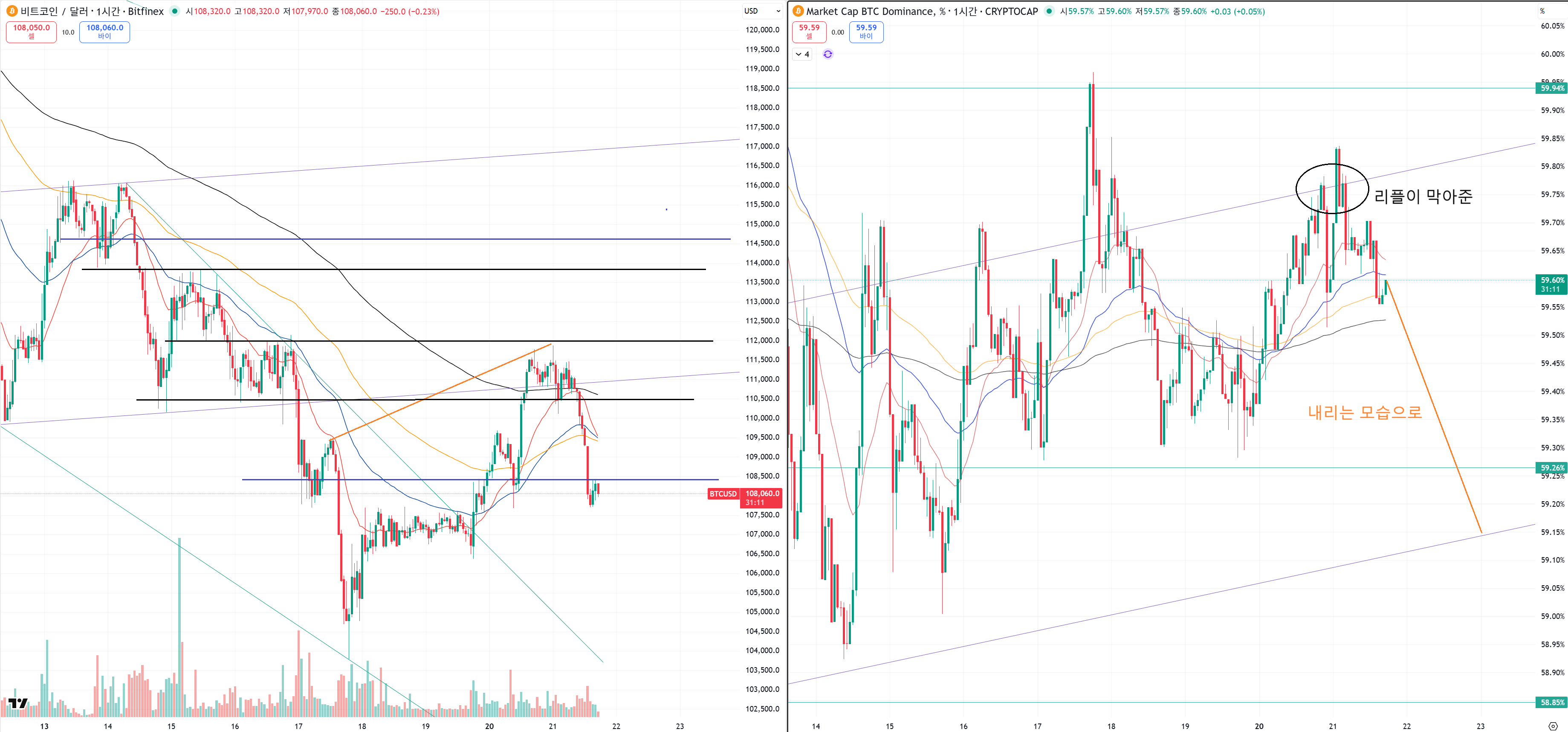 여기서 상승다이버전스 다시 만들거 108500안으로 잽싸게 들어가면 재차 도전 가능합니다.