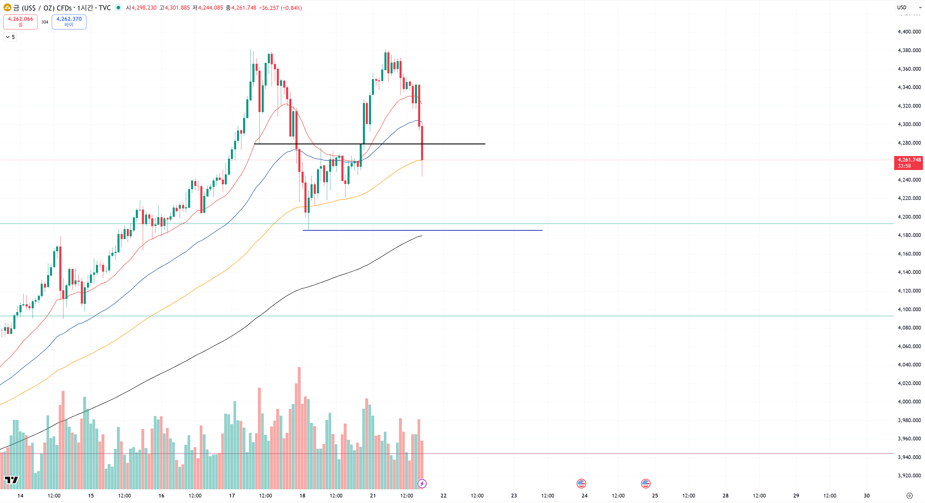 골드의 지금 매수세면 검은색선 기준으로 계속 아래꼬리 만들고 위에서 횡보하면 또 추가 상승을 해요.