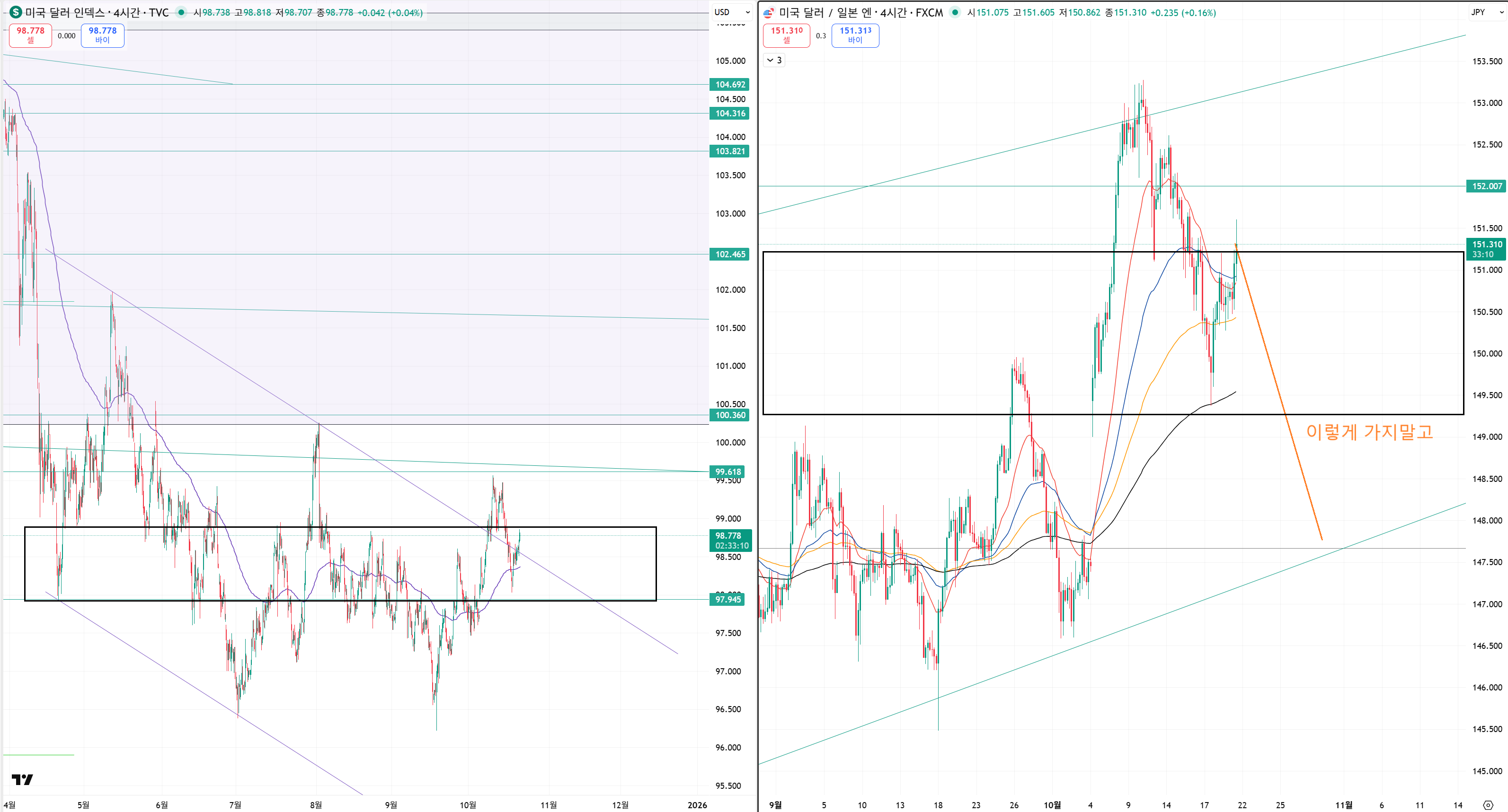 달라인덱스가 버틸때 엔화도 검은색 구간에서 횡보를 해주는게 가장 좋습니다.