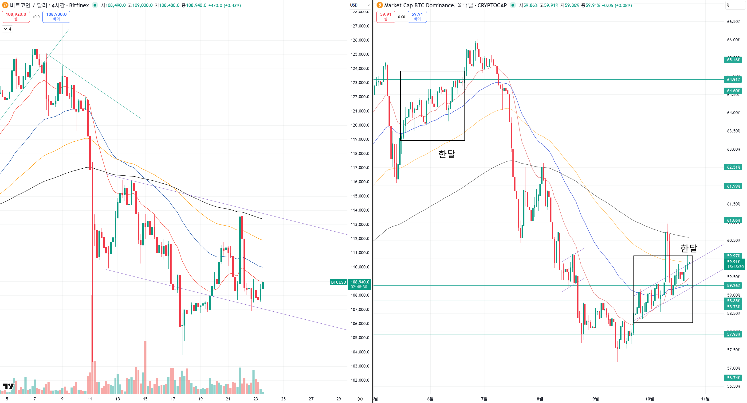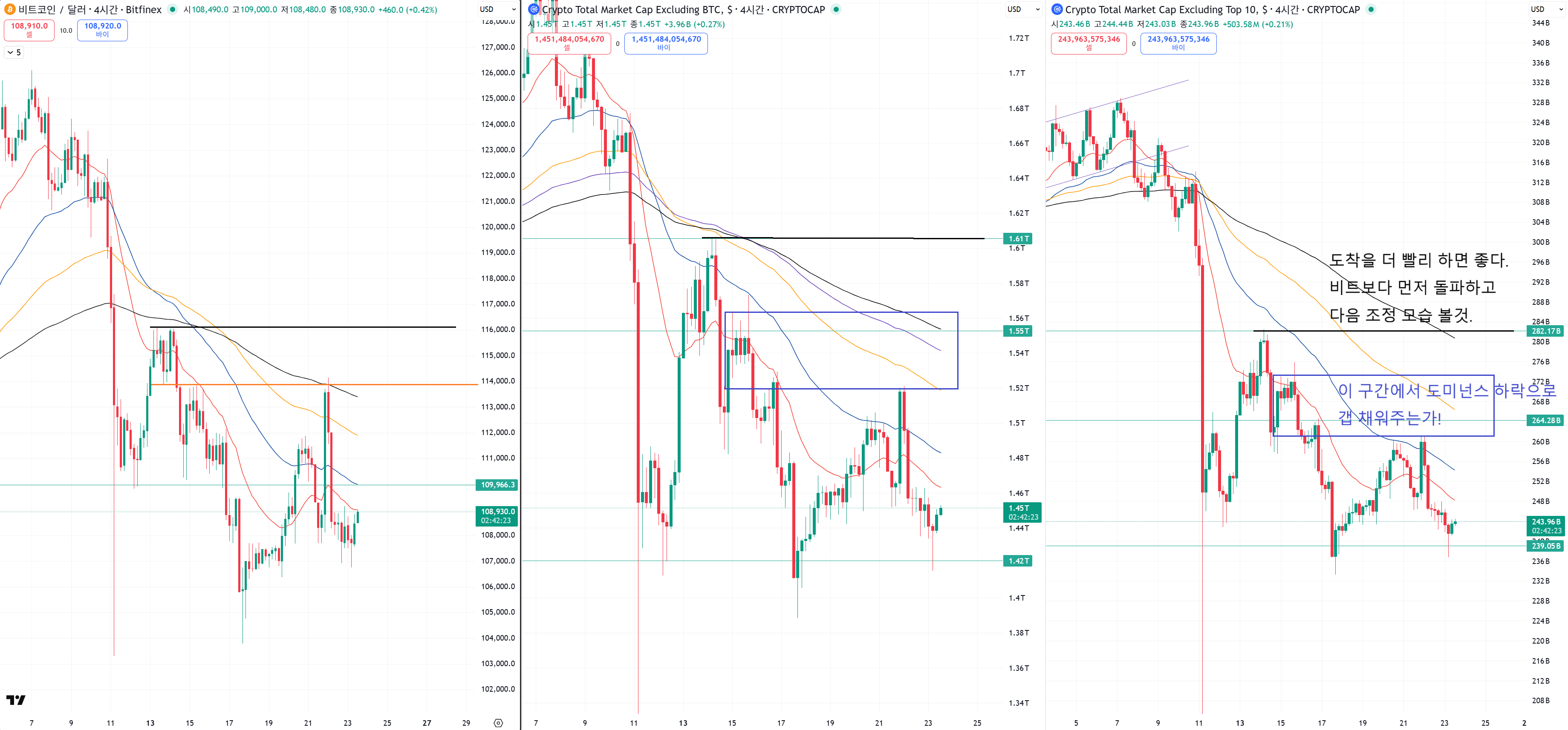 여전히 롱은 108500 위에서 다시 기회를 잡거나 아니면 저점이 한번 더 깨지길 기대해야하는데