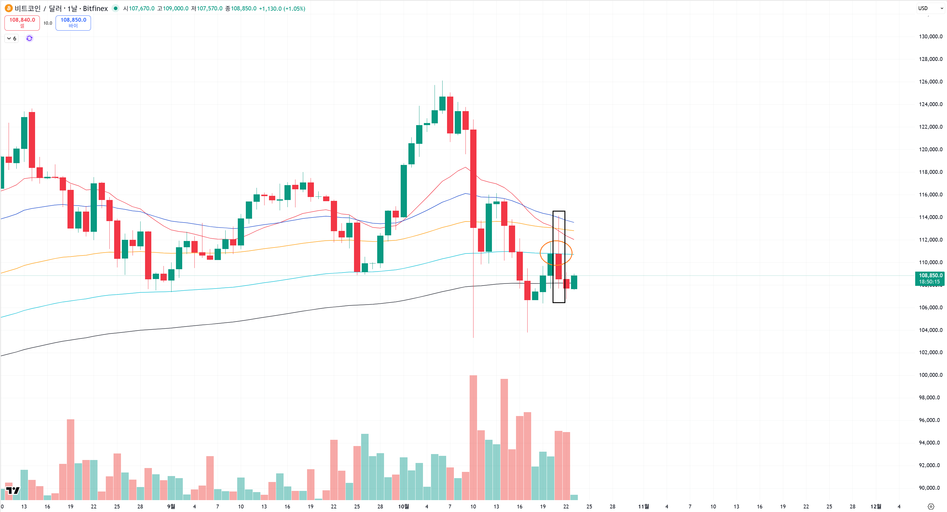 내리지 않고 다시 108500 안으로 들어가서 변동성을 만들어 준며 떡상 할것인가??