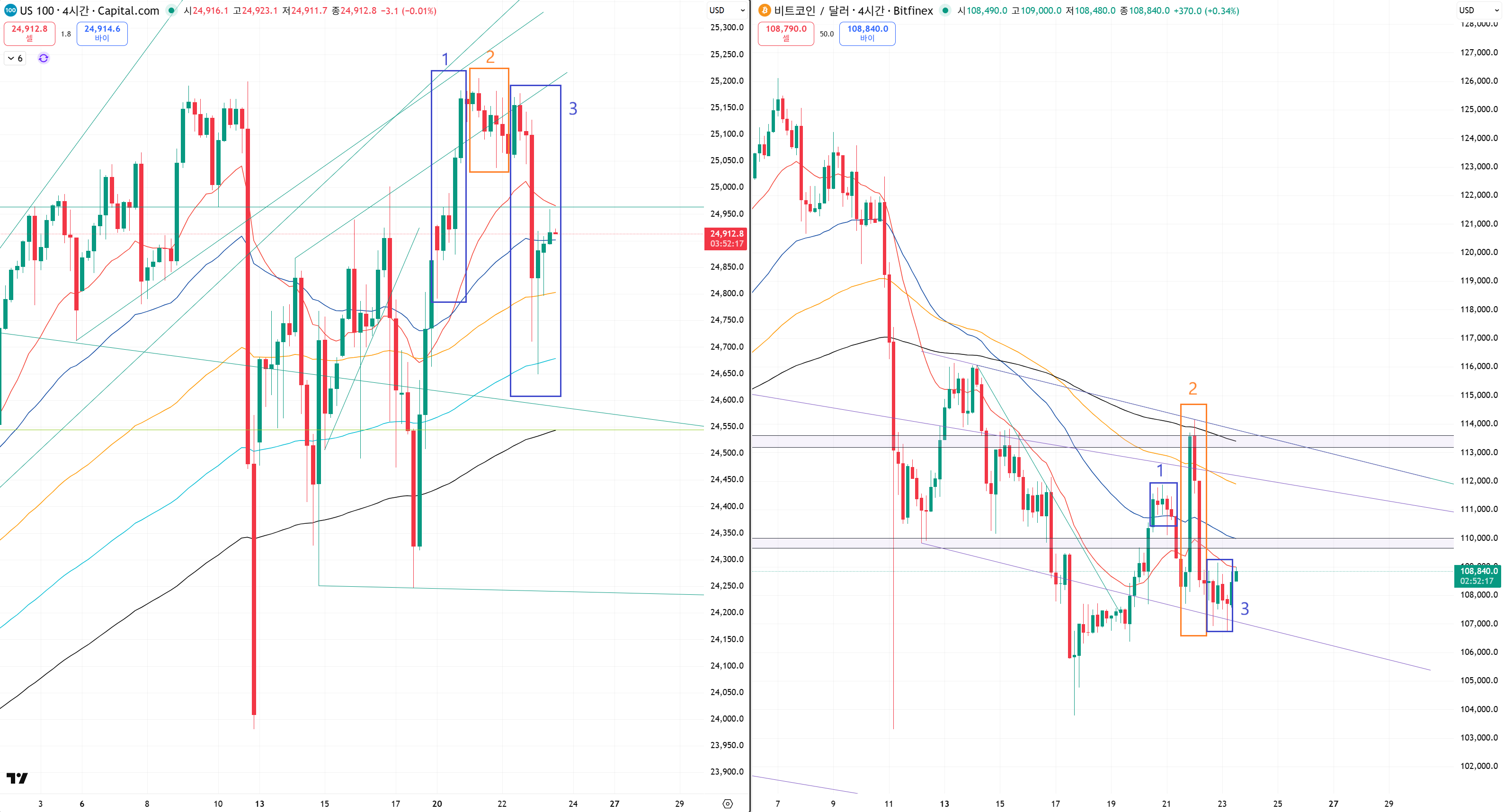 그러니까 목요일인 오늘 미장 시간에 나스닥이 다시 진정하고 비트코인은 변동성이 나올 확률이 매우 높습니다.
