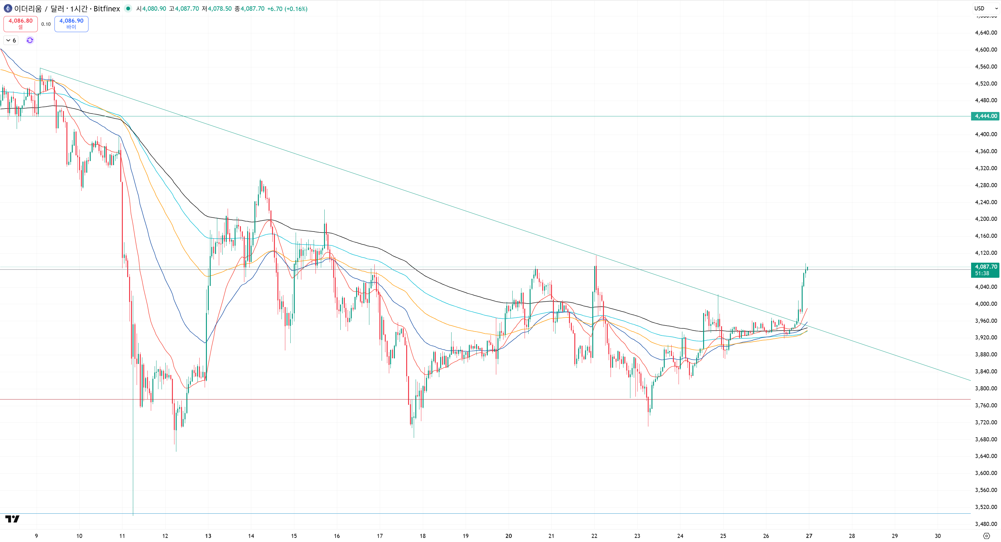 이더리움이 달라차트에서 10월에 만들어 준 하락추세선을 돌파했습니다.