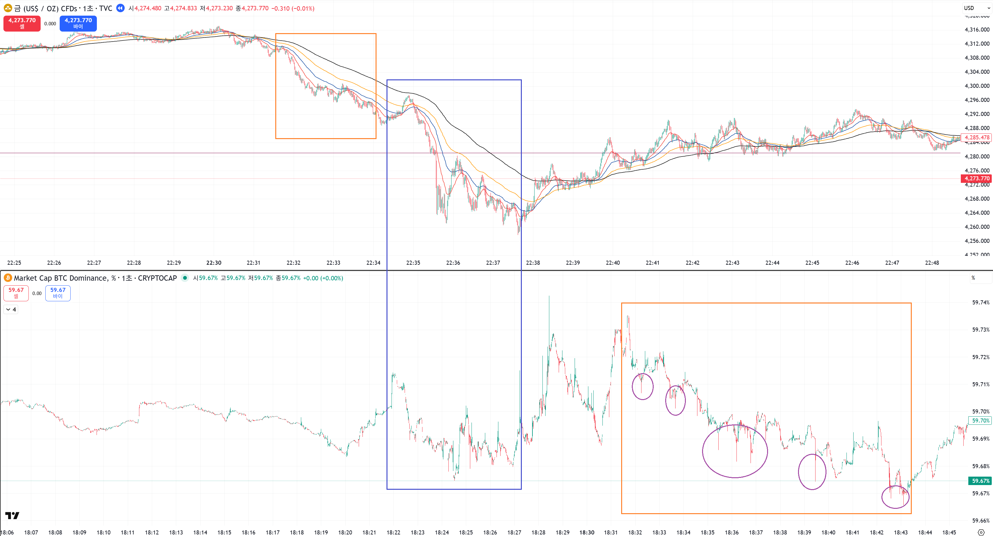 이 자리는 월요일도 수요일도 퐁당퐁당에서 계속 중요 숏 진입으로 하락 가속이 붙던 자리입니다.
