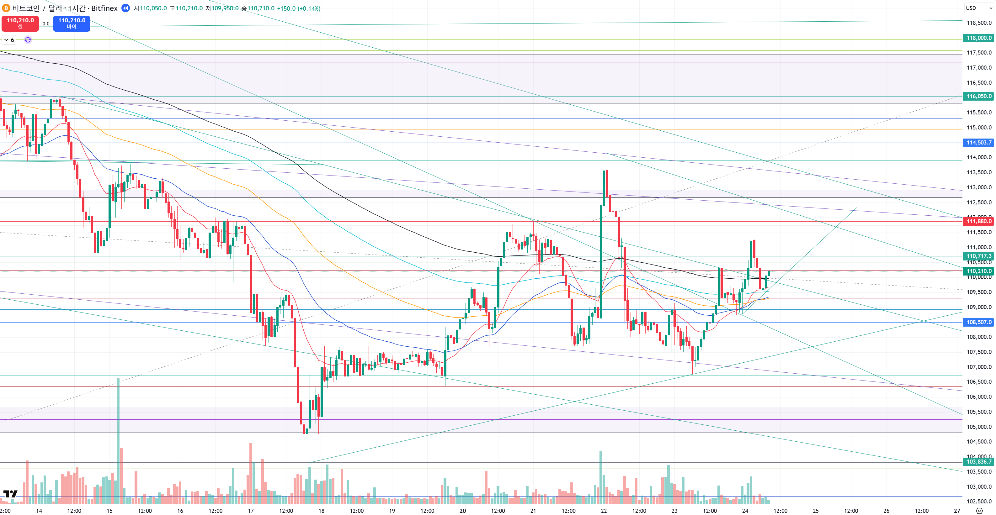 단기적으로 보면 예쁘게 계단식 상승 중이었고 108500 에서 계속 눌리다가 돌파하면서