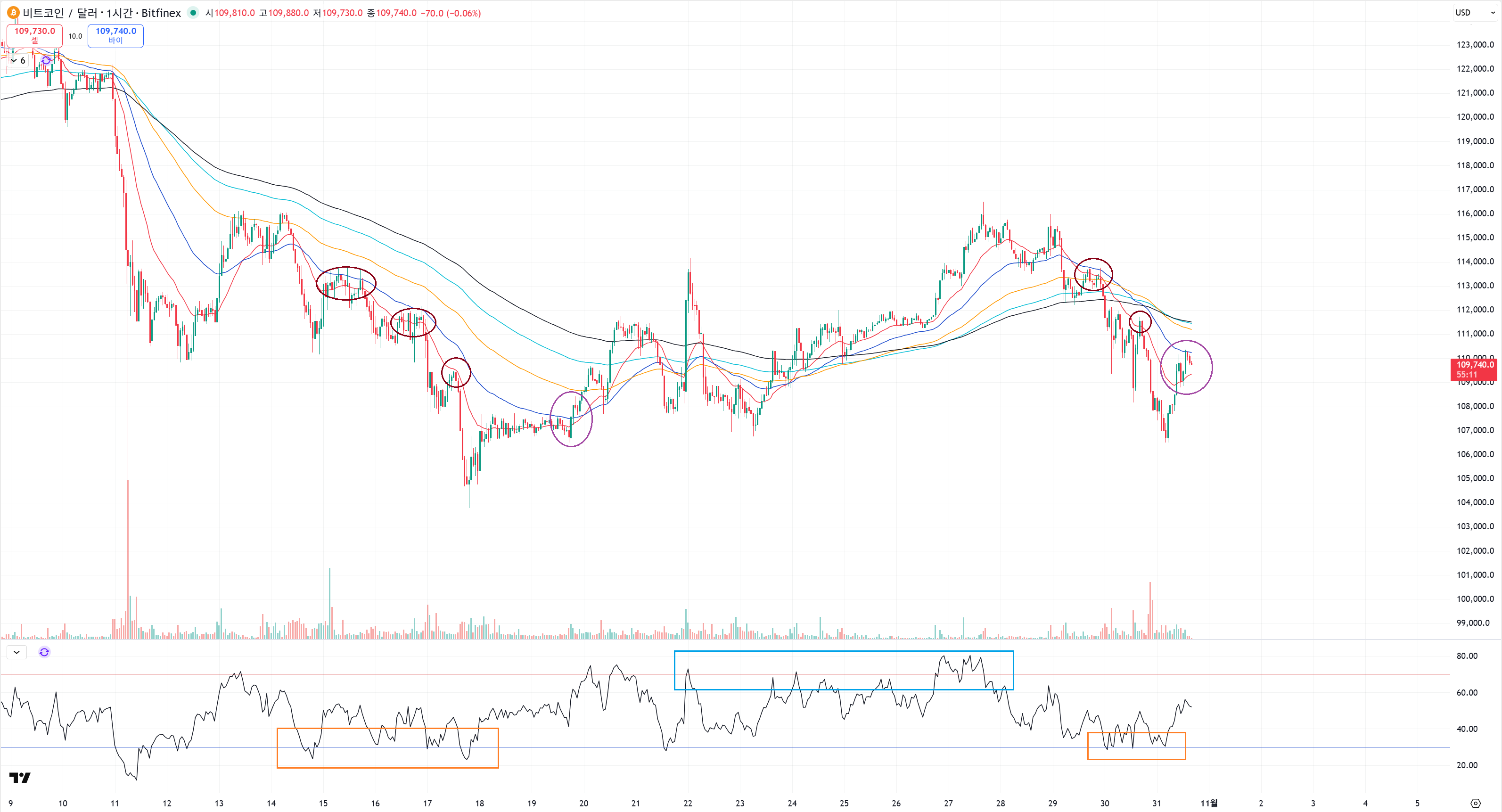 30일에 111800 부근의 저항을 확인하자마나 주황색처럼 무너졌습니다.
