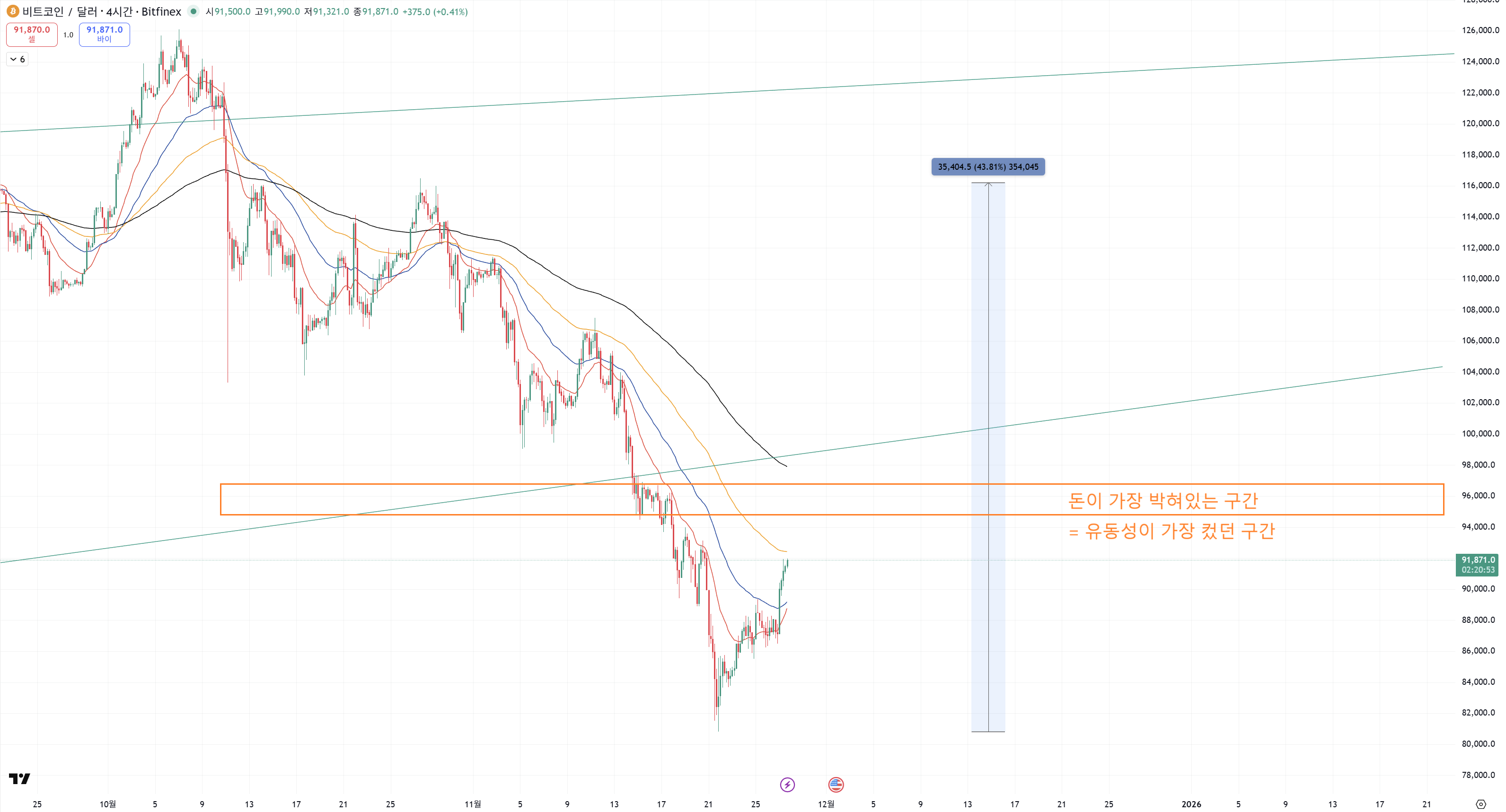 2024년 11월 이후로도 신고점 갱신에 맞춰서 1년간의 움직임에서 가장 많은 돈이 쌓이 자리가 95000입니다.