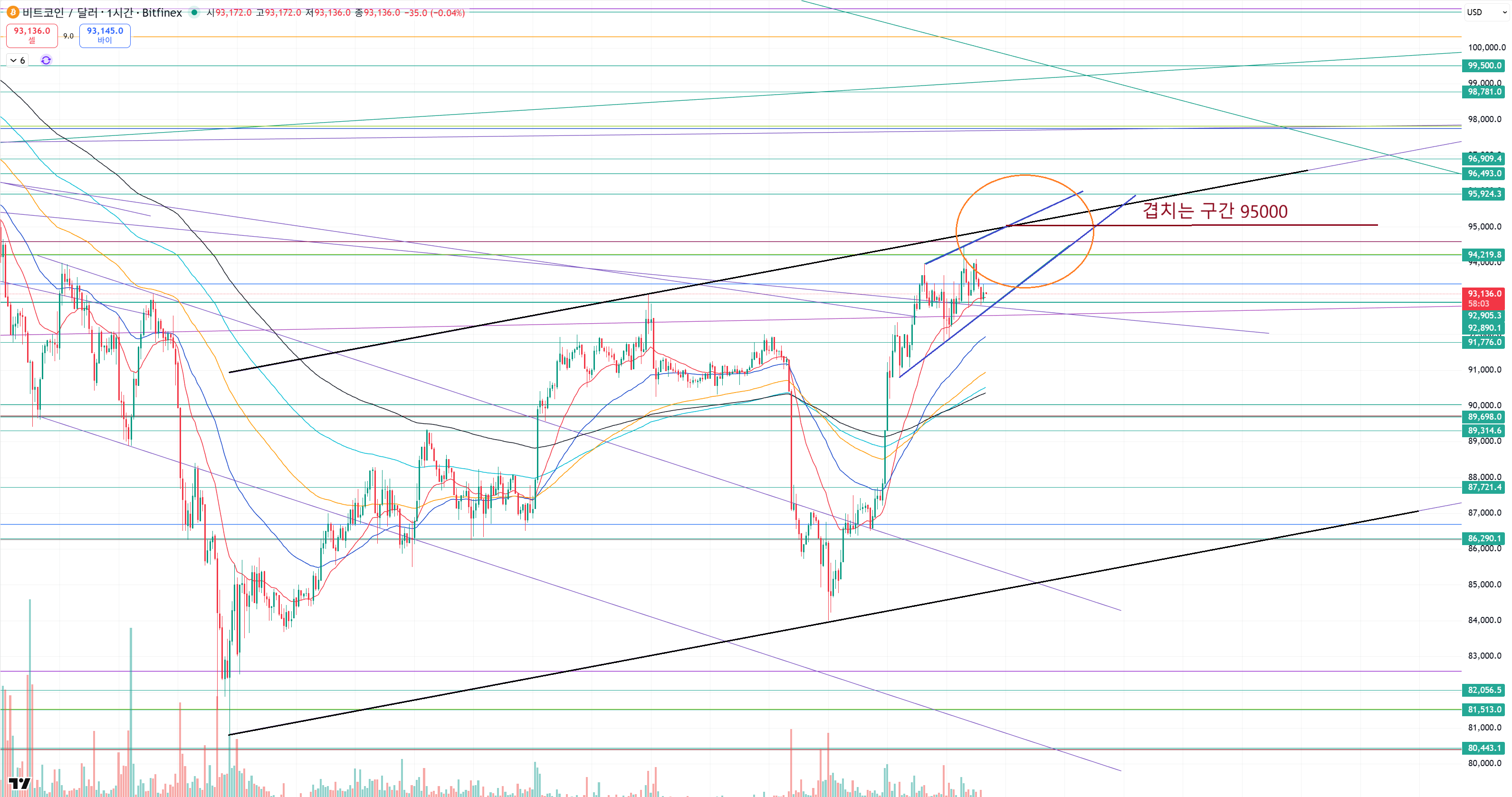 주봉 50일선에서 저항이 나와도 이미 저기 도착을 하는것 자체가 95000을 잘 넘어갔다는게 되니