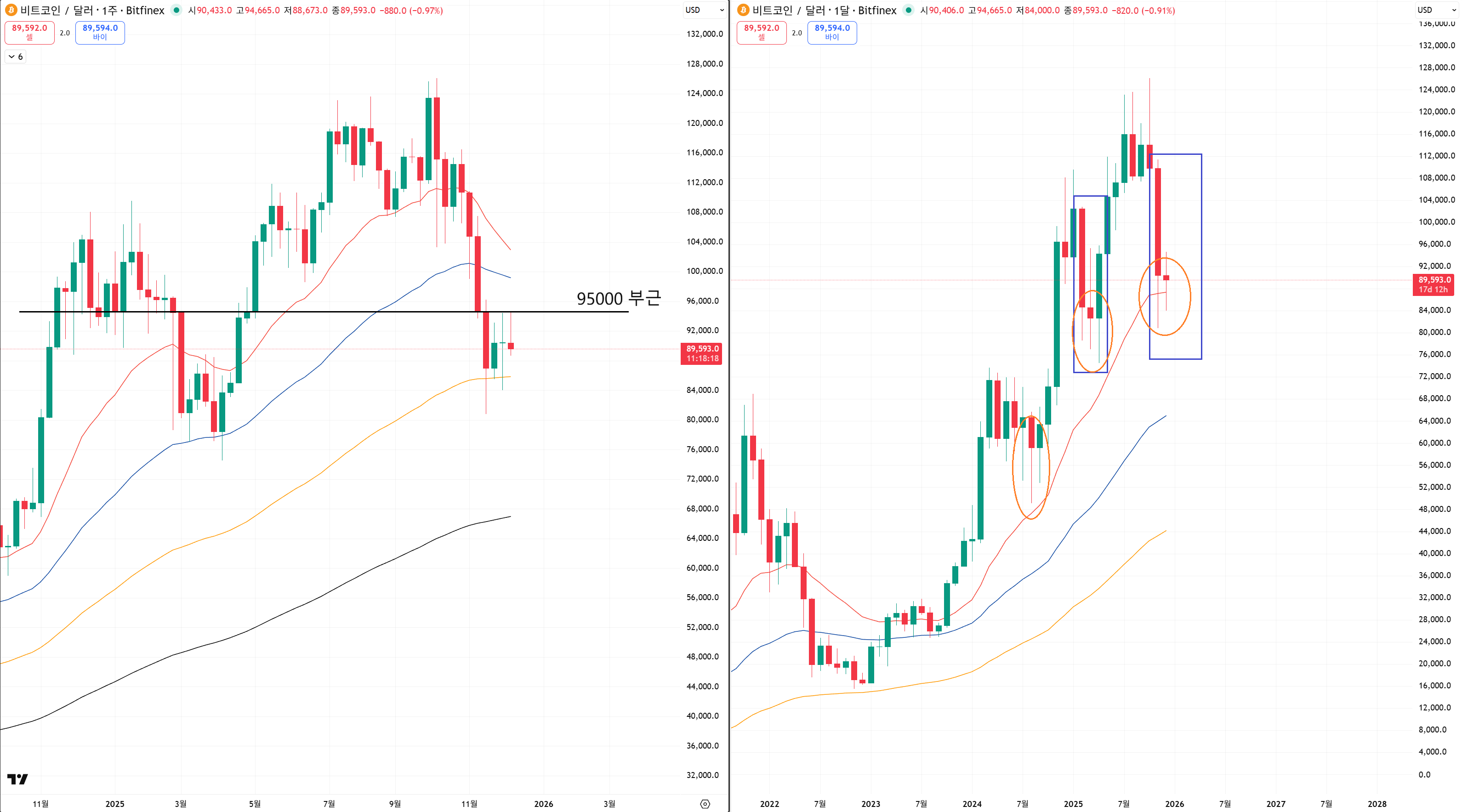 왼쪽 주봉에서도 보면 95000 부근은 돈이 가장 몰려 있던 자리이기도 해서 의미가 있으며