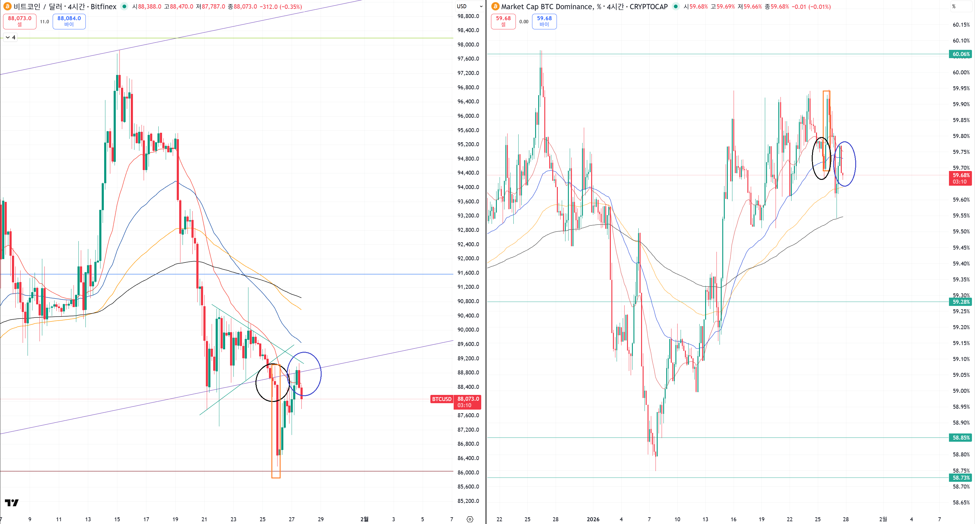 비트코인 하락에서 도미넌스 급상승을 했어요.